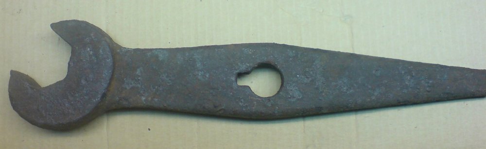 Я не спец, но у америкосов размеры дюймовые, у немцев -метрика. Измерьте под какую гайку. А типа "замочная" скважина -это для вешания на агрегат, чтобы не упал во время пользования. Что то сельхоз, может плуг. Если бы ключ из ЗИПа, тогда не было бы этой "замочной" скважины.