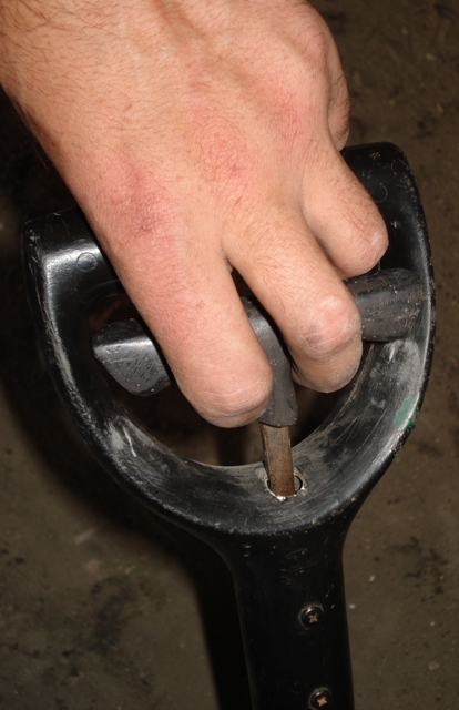 За счёт геометрии черенка лопаты (он не прямолинейный, а с изгибом) + гибкость самого щупа, + правильное расположения отверстия в ручке лопаты + индивидуальная ( к каждому отдельно взятому изделию) формовка и подгонка ручки щупа = надёжная фиксация щупа, что исключает его самопроизвольное выпадение с посадочного гнезда и как следствие потерю.