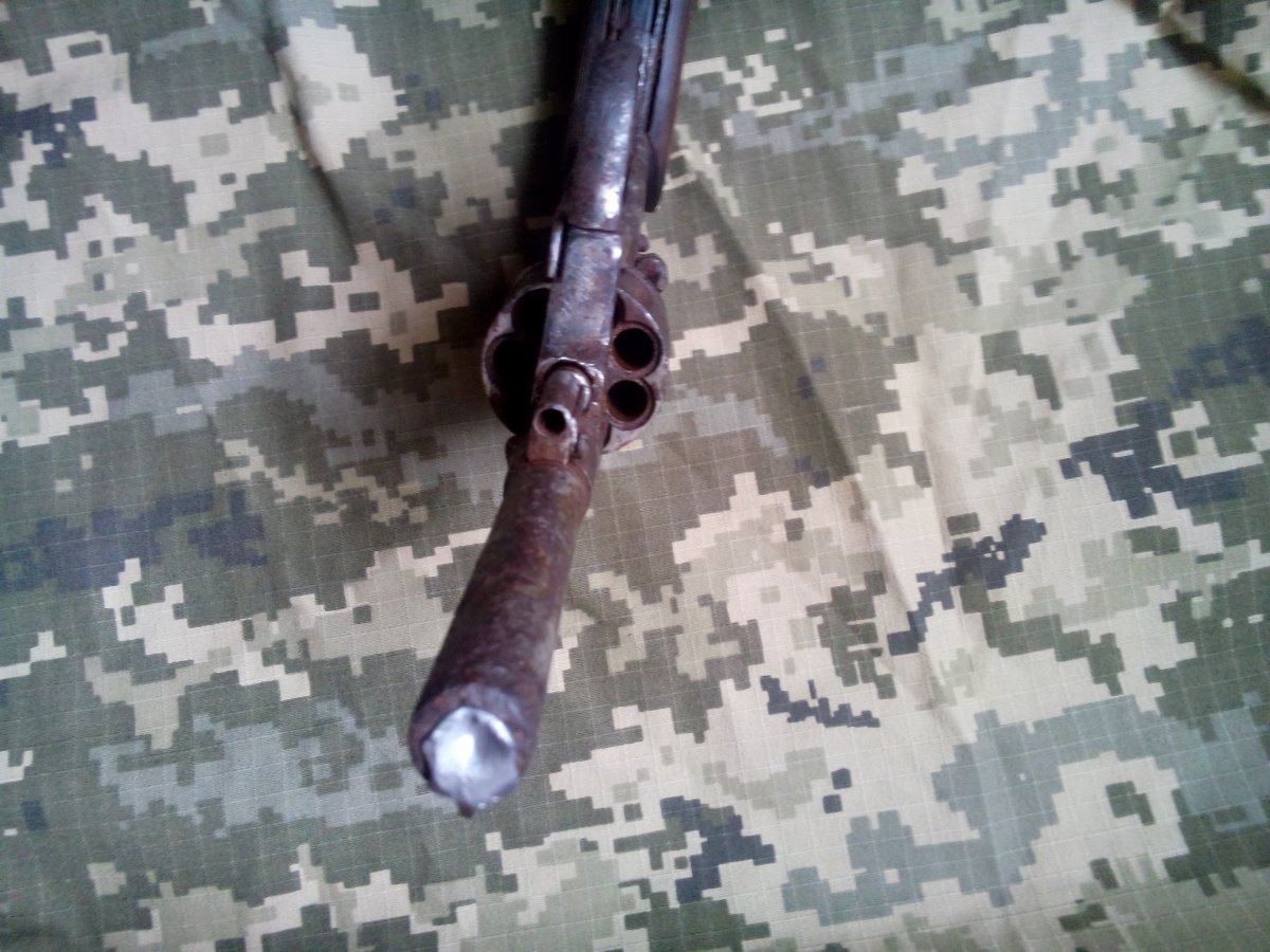 При разборке старого дома обнаружен вот такой Наган - немного заколхожен: накладки, крышка прикручена болтом, ось барабана заменена штифтом. Из плюсов, практически комплектный, ствол, со слов, хороший (ко мне попал уже залитый), каморы барабана хорошие - две под 7,62х25. Пока замочен в керосине, чтобы разобрать.