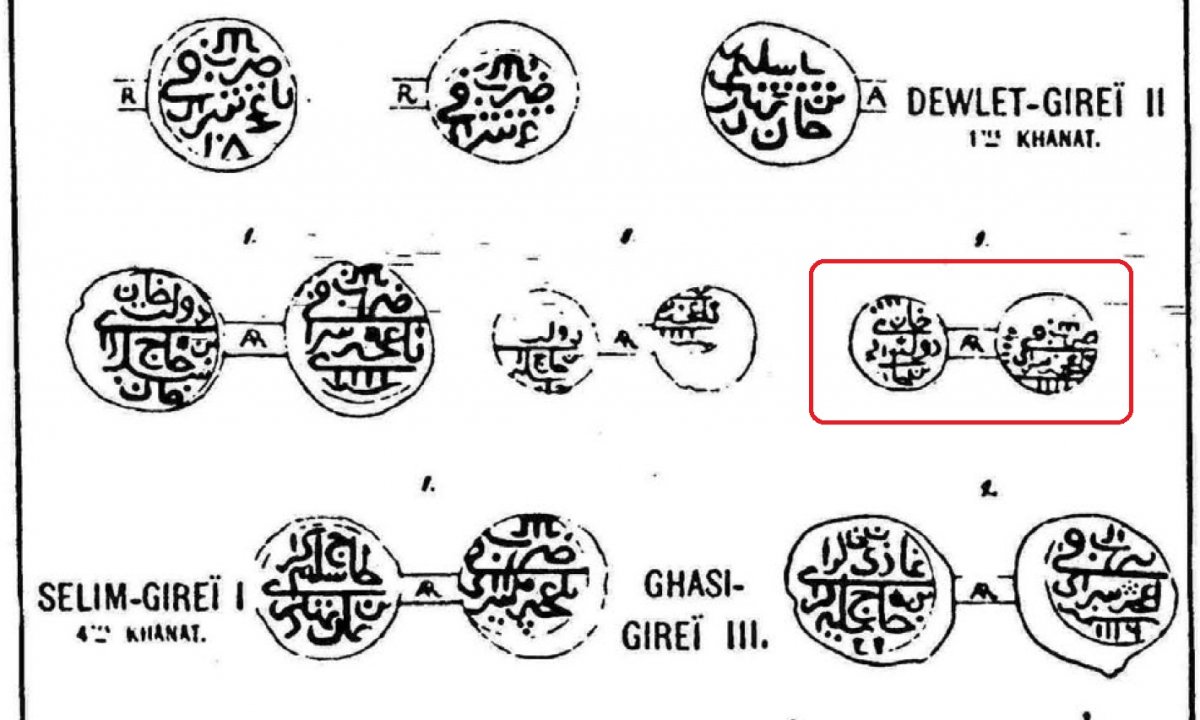 "Сарай" я тоже увидел ... "Бахчи" виделось в верхней строке (сквозь туман ))) ), но сейчас я уже сомневаюсь... вес монетки был бы в помощь, можно было бы отсечь несколько версий ... я просмотрел почти всех Девлетов и бенДевлетов, поищу по Пуладам, может что то отыщется ...