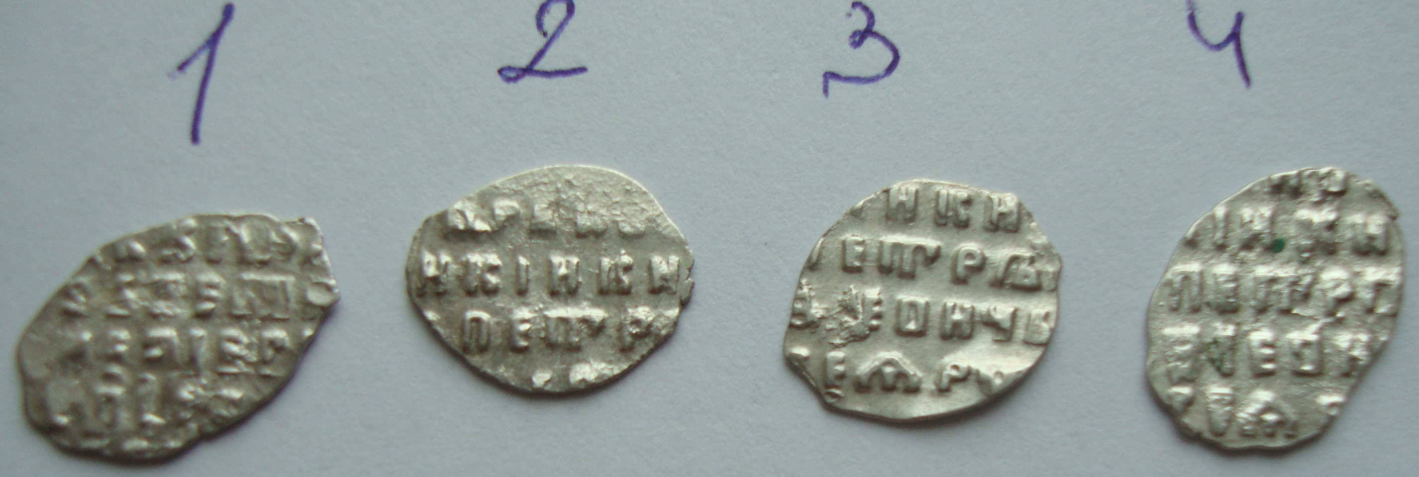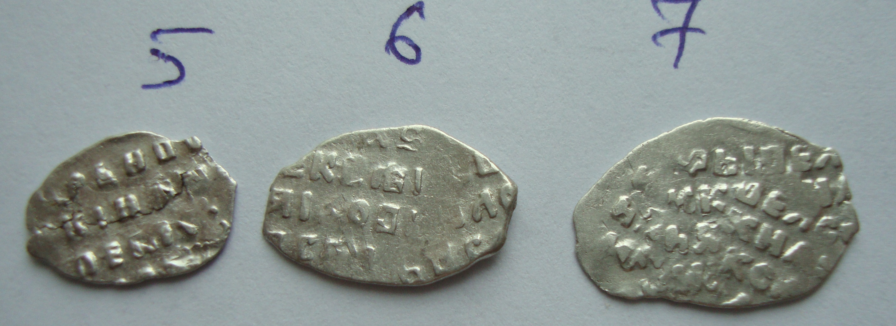 Доброго. 1,2,3,4,5 Копійка Петра 1-ого(1696-1717) Монетний двір: "Старий двір". Не рідкісні і не дорогі. 6,7 Копійка Олексій Михайлович(1645-1676) Монетний двір: Москва. На обох подвійний удар, але ціни не додає, то не рідкість. теж не рідкісні і не дорогі.