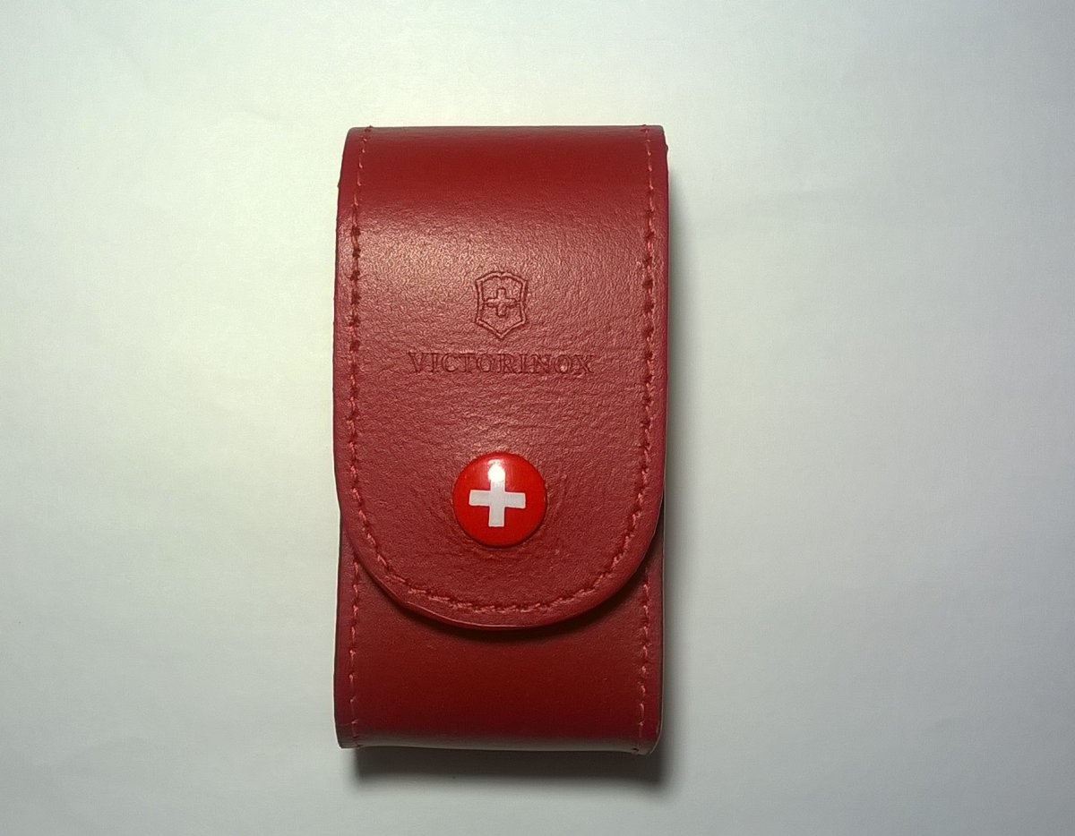 Красный кожаный чехол для ношения ножа Victorinox в вертикальном пололжении на поясе. Подходит (ножи с рукоятью 91мм) толщиной в 5-8 слоев