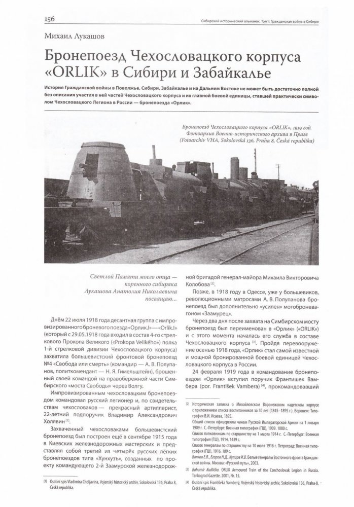 Бронепоезд Чехословацкого корпуса "ORLIK" в Сибири и Забайкалье. Статья, опубликованная в Сибирском историческом Альманахе "Гражданская война в Сибири"