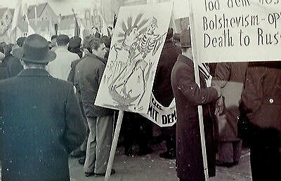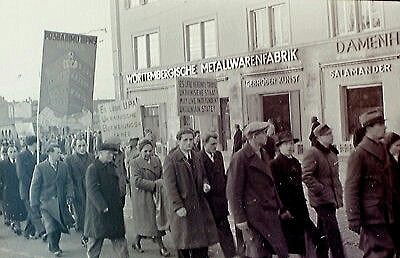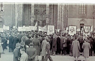 Фотографії післявоєнні. Швидше за все антирадянський протест в Західній Німеччині не виключено що Мюнхен (???). Колону соправаждают чини німецької поліції.
