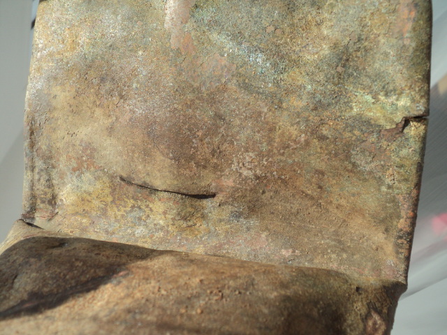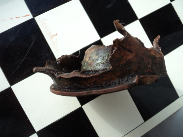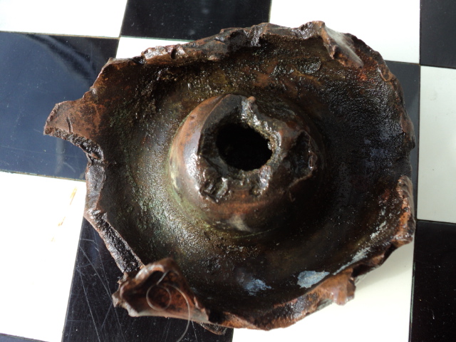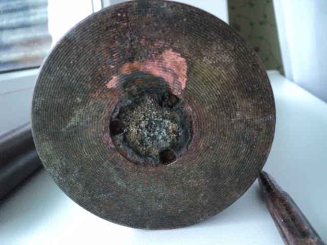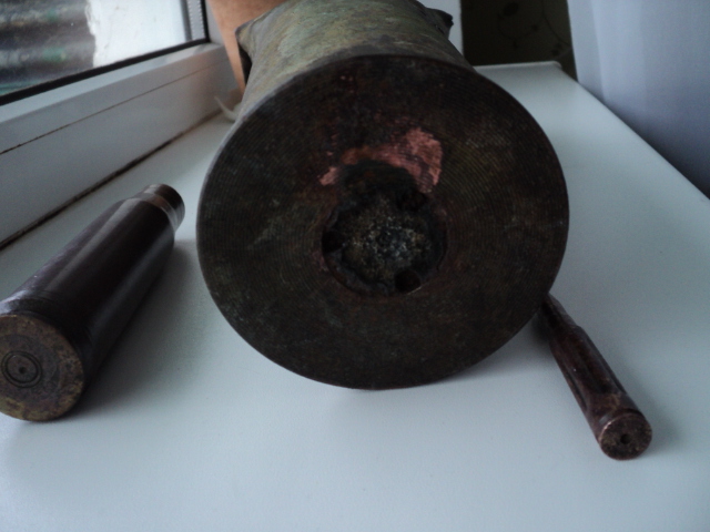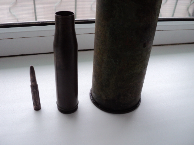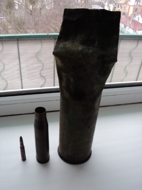 Спасибо. Остатки гильзы, показанной на последних трех фото, выглядят как-то слабее гильзы от 76 мм пушки. Разорванная гильза миллиметра на 2-3 в диаметре меньше, чем от 76 мм. Капсюль у нее латунный, а у 76 мм - железный. Кое-какие знаки удалось разглядеть: маркировка на капсюле "42-М" и буквы "БД", на поле донца в овале "184". Кстати, у первой гильзы в овале "176". Что это значит.