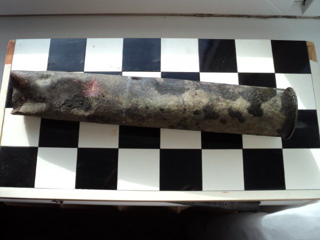 Еще по-меньше попалась. Дли на 31 см, диаметр 53 мм. И огрызок гильзы , диаметр - 79 мм, последствия взрыва. По-видимому, наши. Рядом с ней найден непонятный гусеничный трак. Подскажите, пожалуйста, от каких орудий?