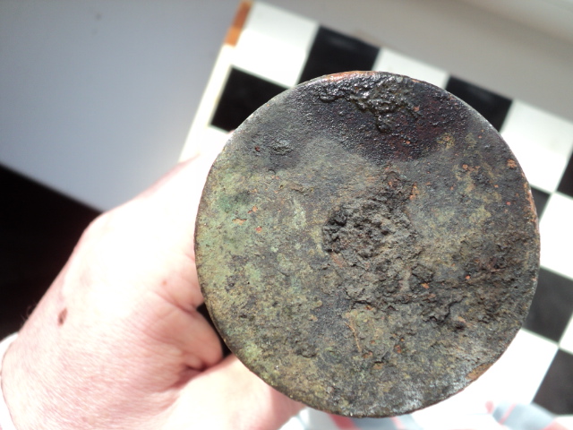 Сегодня в лисьей норе нашел гильзу цветного металла. Диаметр около 8,5 см. Конец касплющен и был согнут. Клейм, вроде, нет. Чья может быть? На фото для масштаба учебнай патрон от маузера и ШВАК.