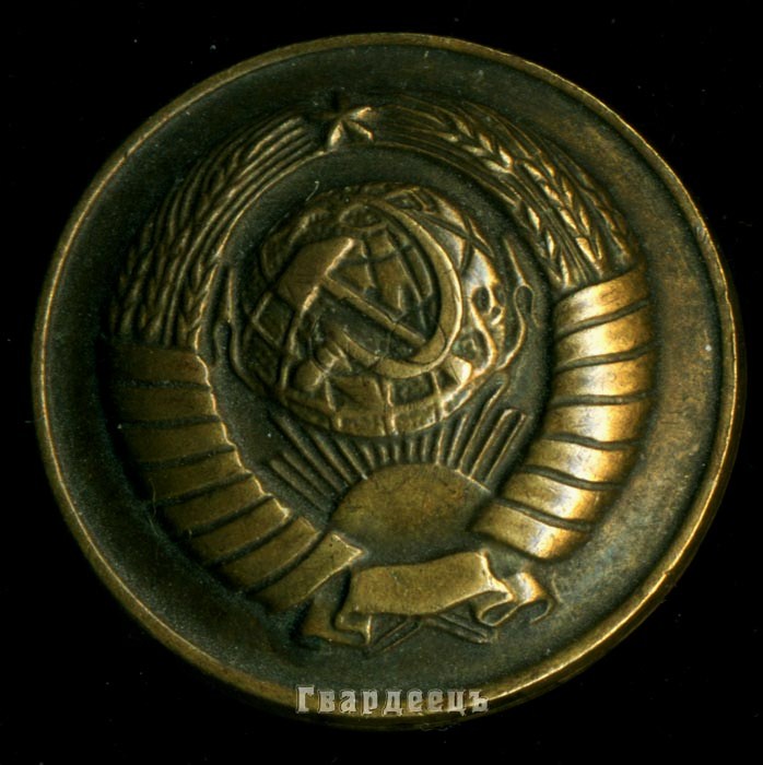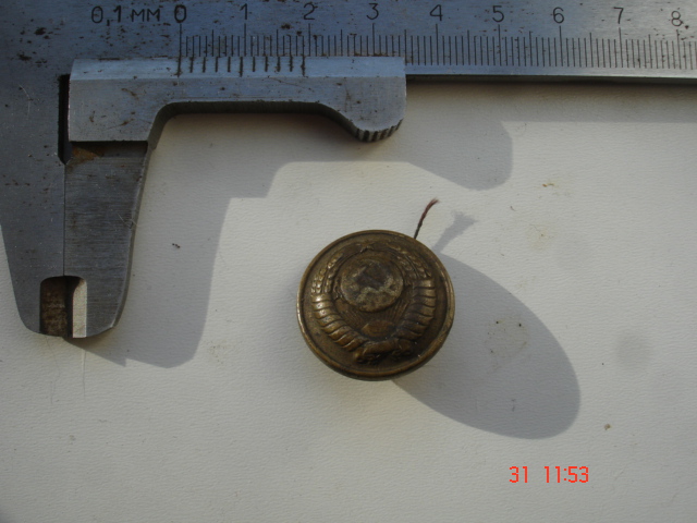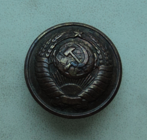 Вот такая же. Обратите внимание, что на пуговицах 16 лент - слева 8, справа 7 и 1 внизу. На гербе на лентах был текст "Пролетарии всех стран, соединяйтесь!" на языках народов СССР. Число лент менялось по числу республик СССР. С 1940 по 1956 год их было 16 (включая Карело - Финскую ССР). То есть, пуговица из того времени. Чья она - на форумах ведутся споры о принадлежности, пока не завершившиеся общепризнанным выводом. В соотвествии с Приказом НКО от 15.01.43г. такие пуговицы, но позолоченные, вводились для парадной формы генералов и маршалов. Какие пуговицы были ведены тогда для повседневной формы, найти не удалось. История представленной пуговицы: Найдена на поле у с. Богородицкое (Васильевка), стоящей на берегу реки Псёл недалеко от Прохоровки. В месте её находки сильного боя не было. Особого значения находке не придал, но сообщил о ней учёному - авторитетному знатоку Курской битвы В. Замулину. Он, подумав, сказал приблизительно следующее: "Есть мемуары начальника штаба 195 Гв. СД Бойко, входящей в 32 Гв. СК Родимцева, в которых Бойко вспоминает как 17 июля 1943 года, после отхода немцев, его дивизия без боя форсировала Псёл в Богородицком. Во время переправы в Богородицкое, инспектируя войска, приехал со свитой (возможно будете смеяться!) маршал Жуков, где и пообедал, пригласив с трапезе Бойко и выпив с ним за обедом коньяка". Других сведений и информации о генералах и маршалах в Богородицком нет, деревенька глухая, заброшенная, около 20 домиков. Кто же потерял там пуговицу?! Фото 1-2: пуговица из Богородицкого; Фото 3: герб СССР с 1940 по 1956 год.
