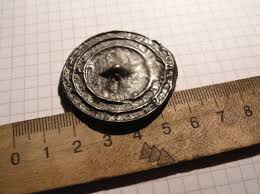 Приветствую всех! На копе попался, вот такой предмет. Обратная сторона была идеально ровная. Уранил в гараже на пол и она разбилась. Скол - белый блестящий металл, тяжелый, не магнитится. Кто нибудь в курсе что это было и из чего сделано. По ВДИ показало 64. Ко всем с уважением!