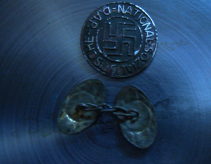 Штука со свастикой помоему "бычий глаз" партийный значек,носили члены партии.