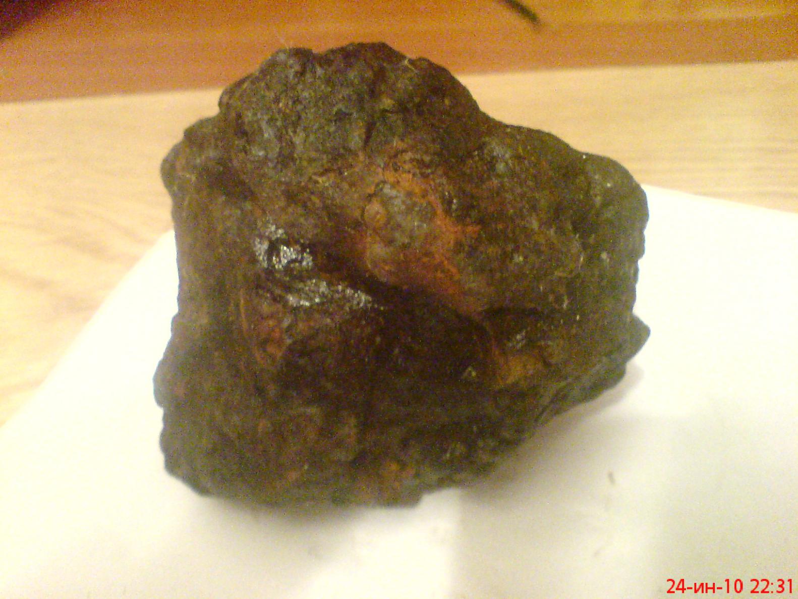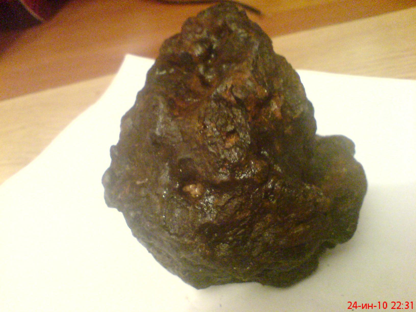 Эсли это метеорит, то однозначно хондрит, в основном из оливина до пероксена, это видно по крестолической оболочке, они зачастую встречаются в 90% случаях, и имеют подобный вид как на фото. Протопланетные Ахондриты, очень редки в железом соотношении с никелем и имеют другую структуру, непохожую данному. Вот они и ценятся, т.к имеют внутрянку. Часто и силикаты ( оливины ) имеют долю ферума, которые бодро реагируют под прибором. По вашему фото сложно судить, так как действительно похож на .......