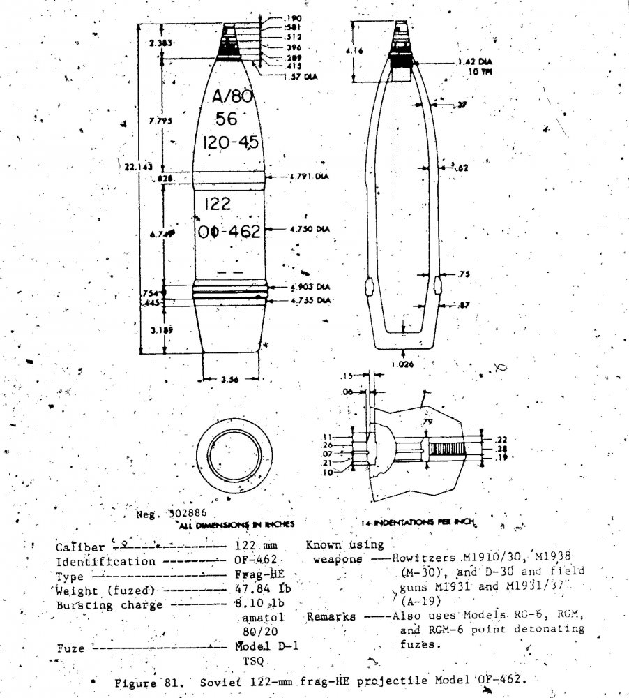 Учитывая отсутсвие КАЧЕСТВЕННОГО фотоматериала с мерным предметом рядом...Любой из приведенных ниже советских 122-мм снарядов. Осколочный, осколочно-фугасный, дымовой....Все "прелести" (ВВ, взрывак) на месте. P/S Схемы и фото из инета. Спасибо авторам.