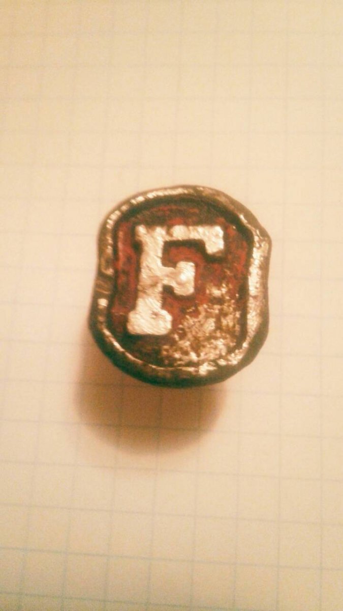 Здравствуйте уважаемые форумчане! Товарищу на копе попалась такая штуковина, очень напоминает печать, но есть два но: буква "F" по идее должна быть повёрнута в другую сторону и отверстие не сквозное. Прошу помощи в определении находки. С ув. Фото