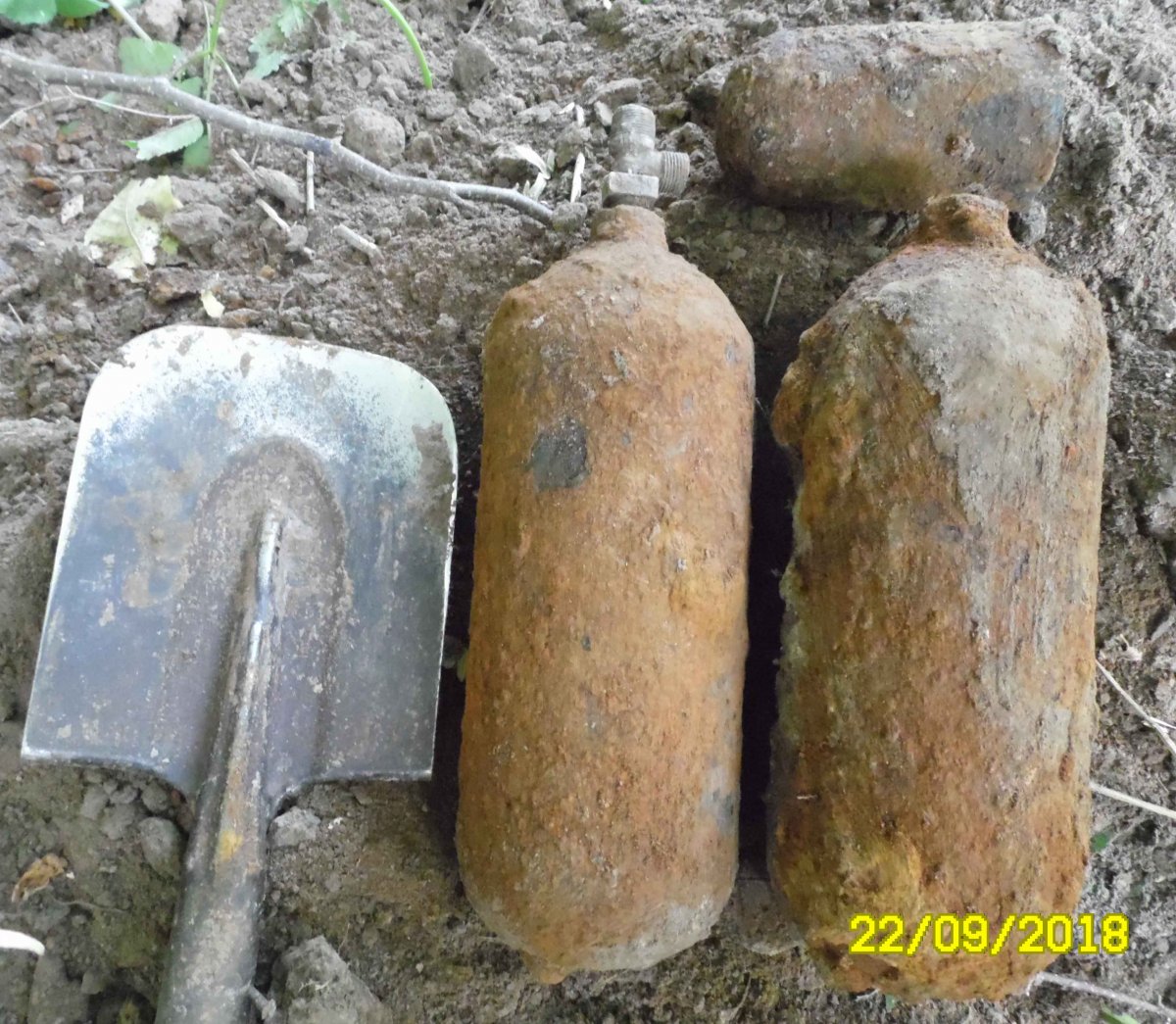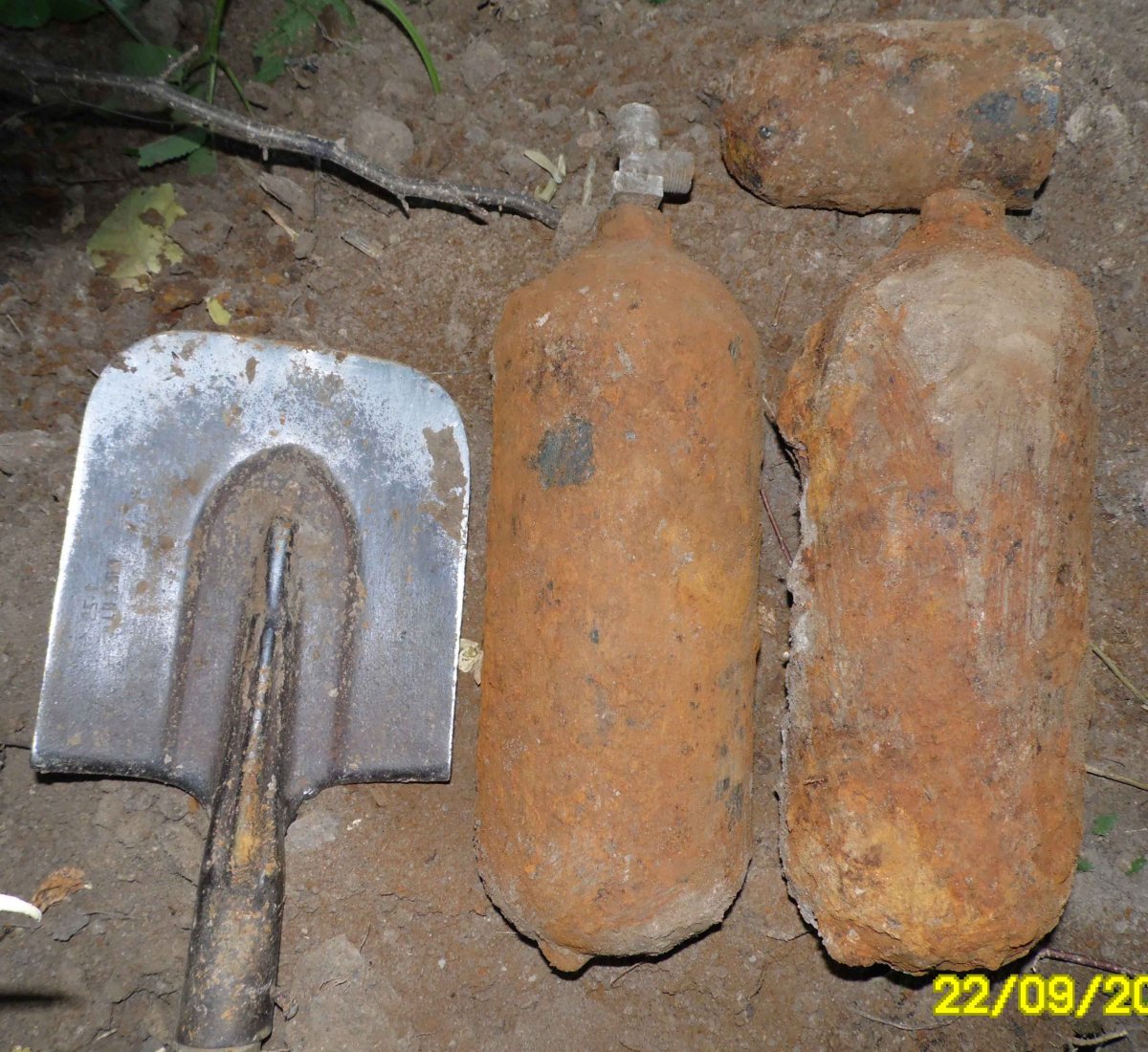 Приветствую! Попались в окопе такие вот то ли балоны, то ли огнетушители. Для размера положил лопату БСЛ-110. Там и оставил, мало ли что. Внутри жидкость. Заранее благодарен.