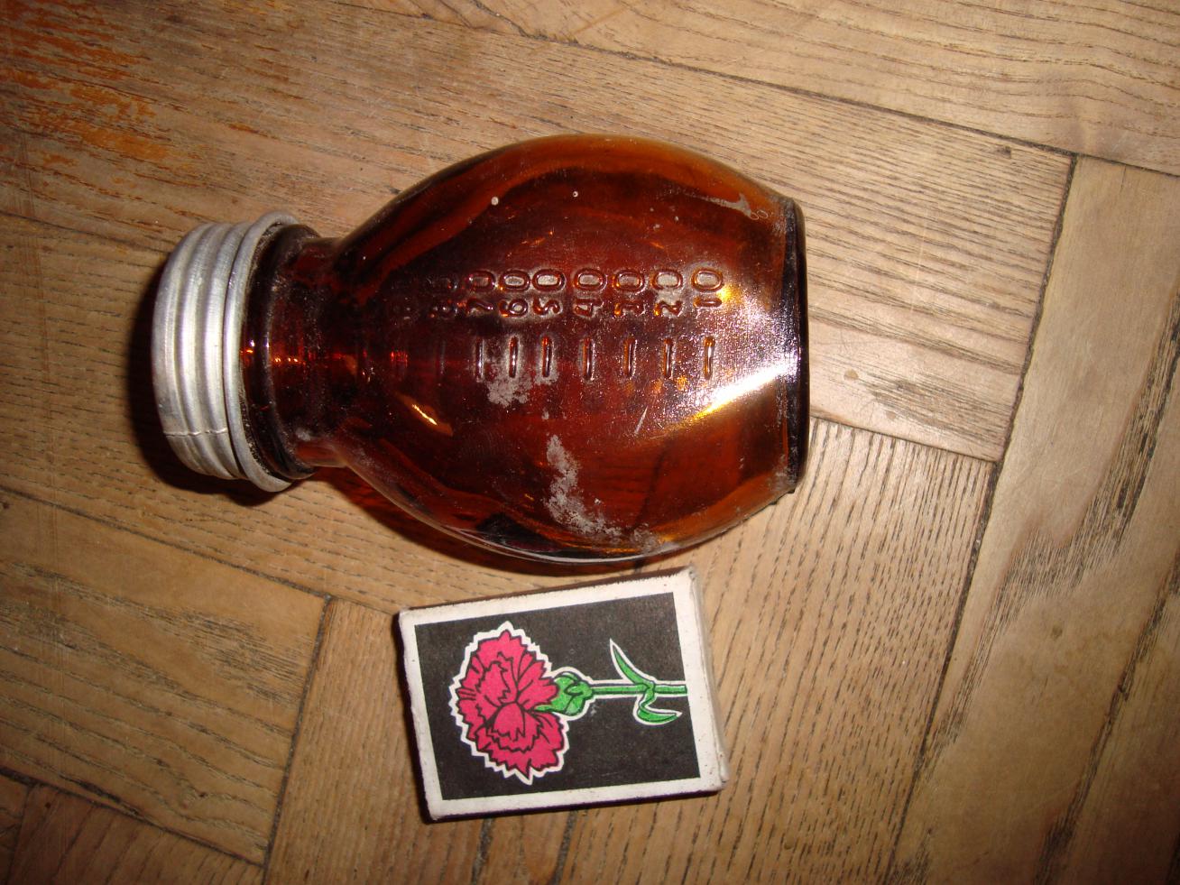 Попалась такая бутылочка с мерной шкалой, конструкция алюминиевой пробки, схожа с некоторыми пробками от разных армейских девайсов, что намекает на его происхождение и причастность к армии. Хотя точно неуверен.