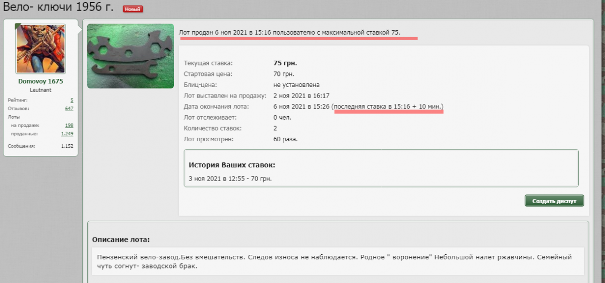Добрый день. Я что-то непонял с етим лотом. https://reibert.info/lots/velo-kljuchi-1956-g.779781/ Дата окончания лота: 6 ноя 2021 в 15:26 (последняя ставка в 15:16 + 10 мин.) А в 15:17 пришло соопщение что я не выиграл как так? Ведь я сидел и каждую секунду обновлял страницу перебитой моей ставки небыло. Ето что было то? Где 10 минут то. Аукцион должен был закончится в 15:26 а не в 15:16.