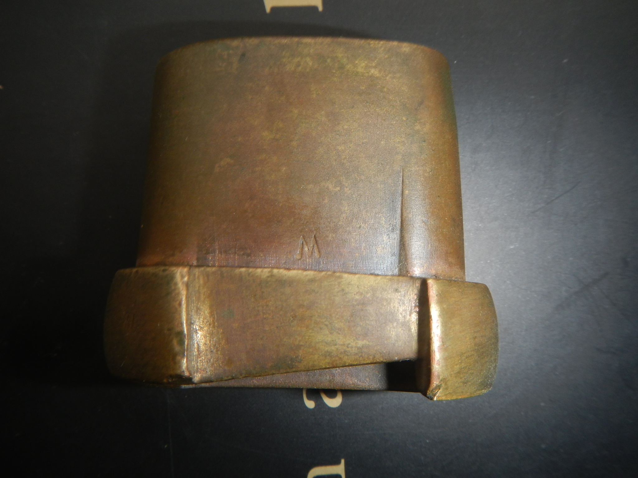 Устье ножен шашки кавалерийской 1927 года образца. М – предположительно соответствует фамилии приемщика Мандич П.П. клеймо М ставилось на шашки 1940-1941 г.в. и заменило собой все клейма за исключением клейма завода-изготовителя)