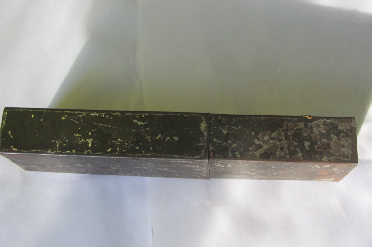 Лужоное-тонкое железо,а сверху покрашено.Цвет тёмно-зелёный-похож на немцев.