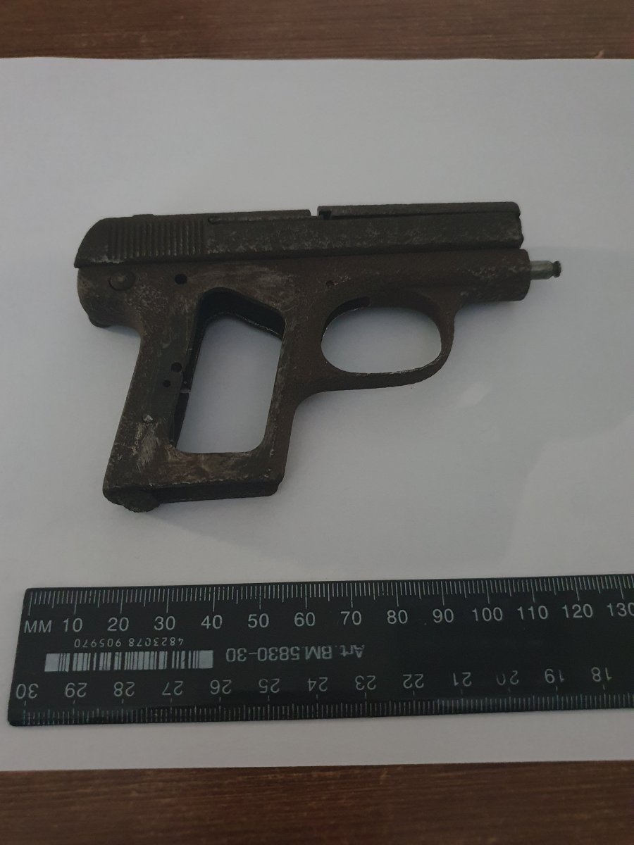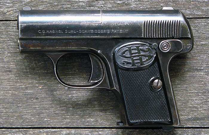 Германия, кал. 6,35-мм, пистолет Haenel-Schmeisser Model 1. "....В 1921 году Хуго Шмайссер, ранее работавший у Теодора Бергмана, стал главным инженером предприятия «Хенель». К этому времени у него была готова конструкция карманного автоматического пистолета калибра 6,35 мм со свободным затвором, которую Шмайссер запатентовал в 1920 году. У пистолета было несколько необычных черт: в частности, ствол удерживался на месте направляющим стержнем возвратной пружины, который проходил сквозь прилив ствола под патронником и упирался в гнездо рамки. Флажковый предохранитель пистолета был соединен с защелкой магазина таким образом, что магазин нельзя было извлечь, не поставив оружие на предохранитель, но и нельзя было поставить предохранитель в положение «огонь», не вставив магазин. Выпуск этого удачного пистолета начался в 1922-м и продолжался до 1930 года. На его затворе-кожухе была выштампована надпись С. G. HAENEL SUHL – SCHMEISSER'S PATENT, а на щечках рукоятки имелась аббревиатура HS, которую некоторые расшифровывают как «Хенель-Шмайссер», а некоторые (и это, по-видимому, правильнее) как «Хенель-Зуль»....." https://grozab.livejournal.com/263821.html