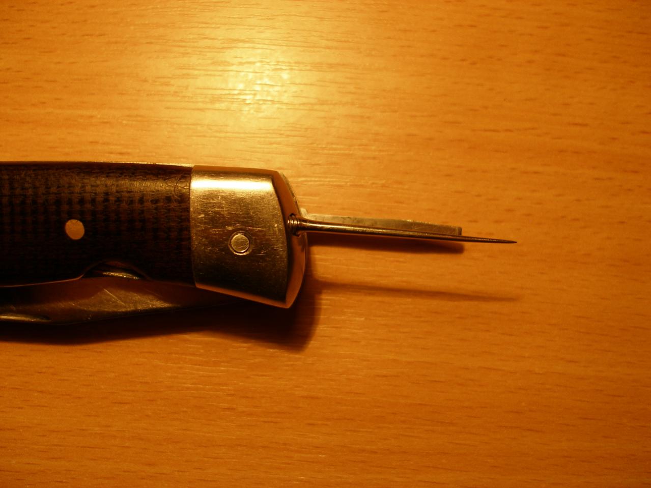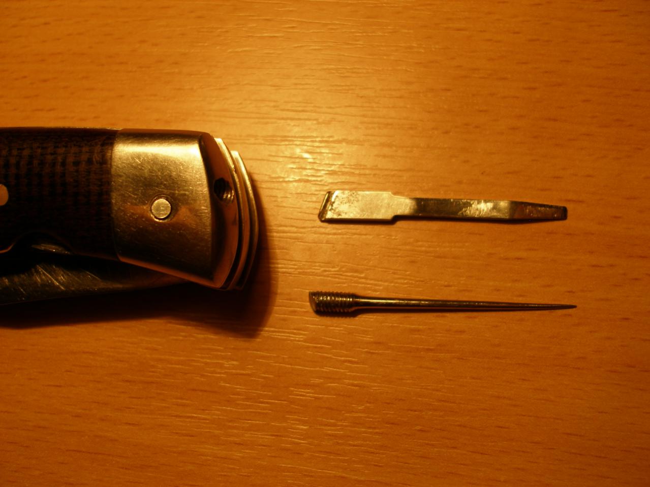 Этот нож ко мне попал еще в 90 годы.Под залог оставили за бутылку водки,да так и остался у меня.От прежнего владельца только успел узнать что лезвие выщерблено потому что им бросали.... Ну и следы заточки прежнего владельца тоже видны.С тех пор он у меня!Нож просто супер !!!Длинное лезвие,отлично сидит в руке,отменно держит заточку!Вот возник вопрос что за нож?Зона,производство СССР или заграница?Многие говорят что зоновская работа,но не похож уж очень он сложен для таковой,да и никогда не видел такого крепления шила и отвертки.СССР тоже вроде таких не выпускал,вот и возник у меня вопрос что это?Может кто видел подобные?