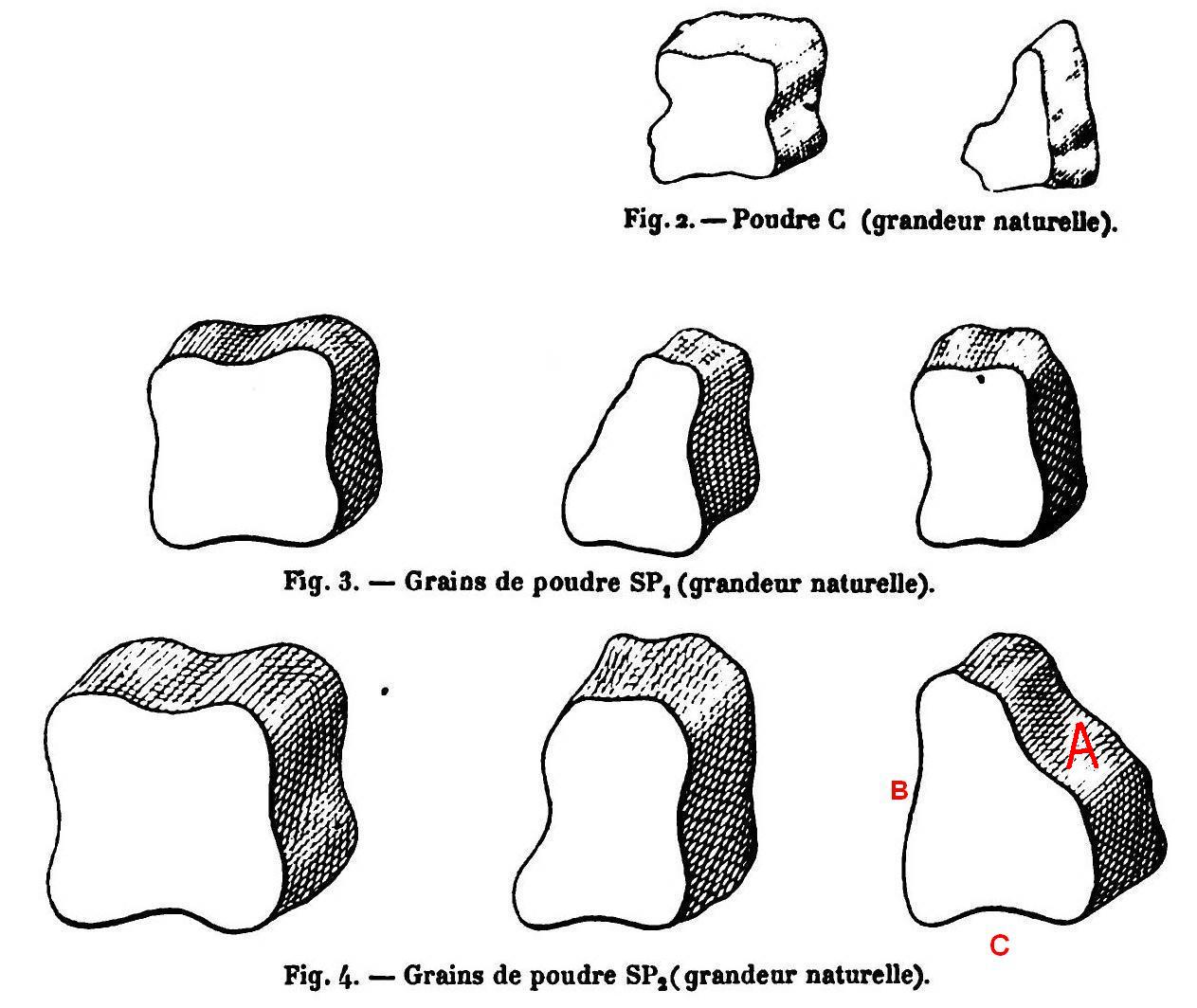 "Главные сведения, относящиеся к различным военным порохам, были объединены в таблице, с добавлением указаний по их назначению или применению. Новые пороха для винтовок обозначены буквой F (от fusil) с индексом (цифрой) после неё (прим. пер. - чем больше цифра, тем крупнее или/и толще порох), для полевых орудий C (compagne), для осадных и крепостных орудий SP (siège et place), за которыми также следует индекс. В морском ведомстве обозначение порохов включает начальную букву производителя (напиример: S для порохового завода (фабрики) Sevran-Livry, B для Bouchet, W для бельгийского Watteren) (перед которой иногда ставится буква (с индексом или без) обозначающая способ производства) и данные указывающие размер зерна. Например: AS 13/20 обозначает порох изготовленный пороховым заводом Sevran-Livry способом A c зерном толщиной 13 мм и наибольшим размером 20 мм." (с)