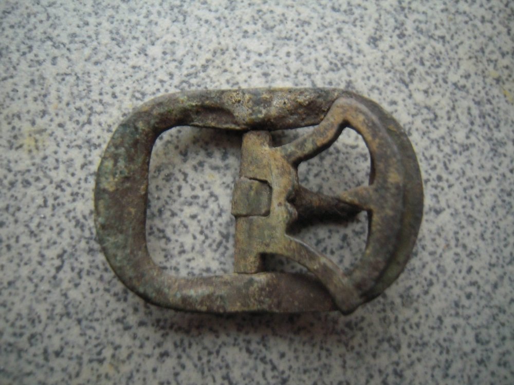 Приветствую Вас! Вот найдена была пряжка или карабинчик? Недалеко от ганс. позиций. Материал-похож бронза или латунь(не чистил, обмыл). Подскажите,от чего? С УВ.