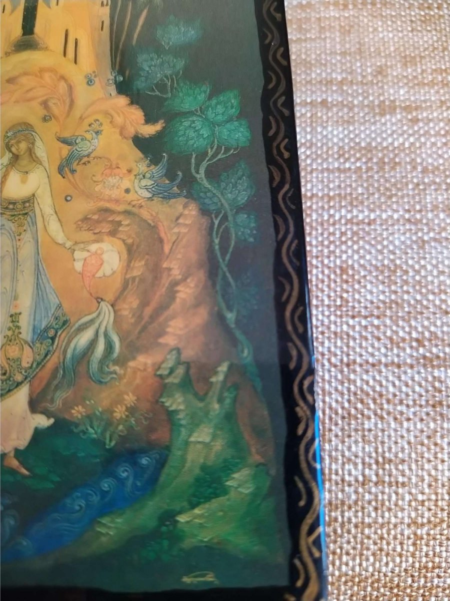Прекрасная шкатулка производлства Палех. Серия - "сказки Пушкина". Не могу рассмотреть год и автора. Если дадите фамилию, можно будет найти.