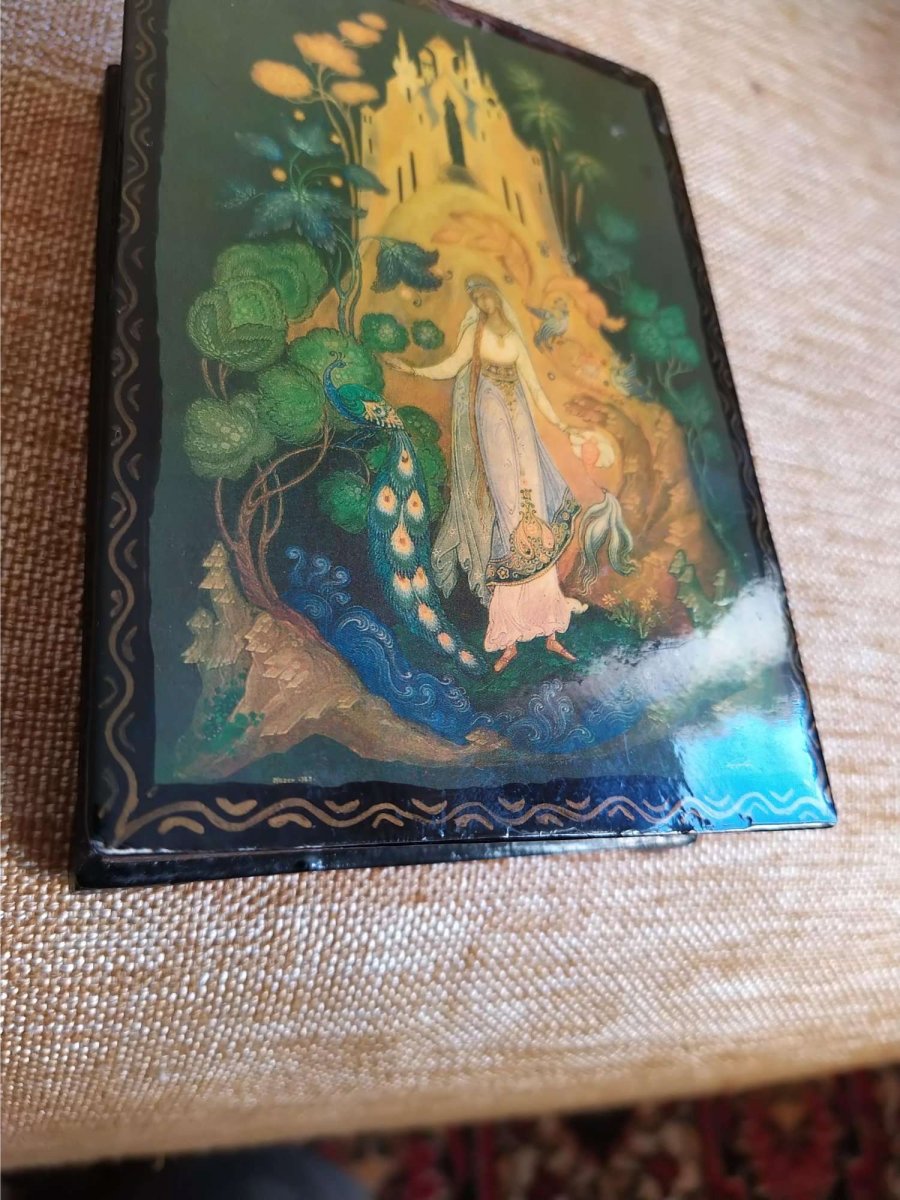 Добрый вечер, подскажите что за шкатулка? Дерево лак краски, в живую очень красивая, с чердака, написано вроде 1963 пелех?