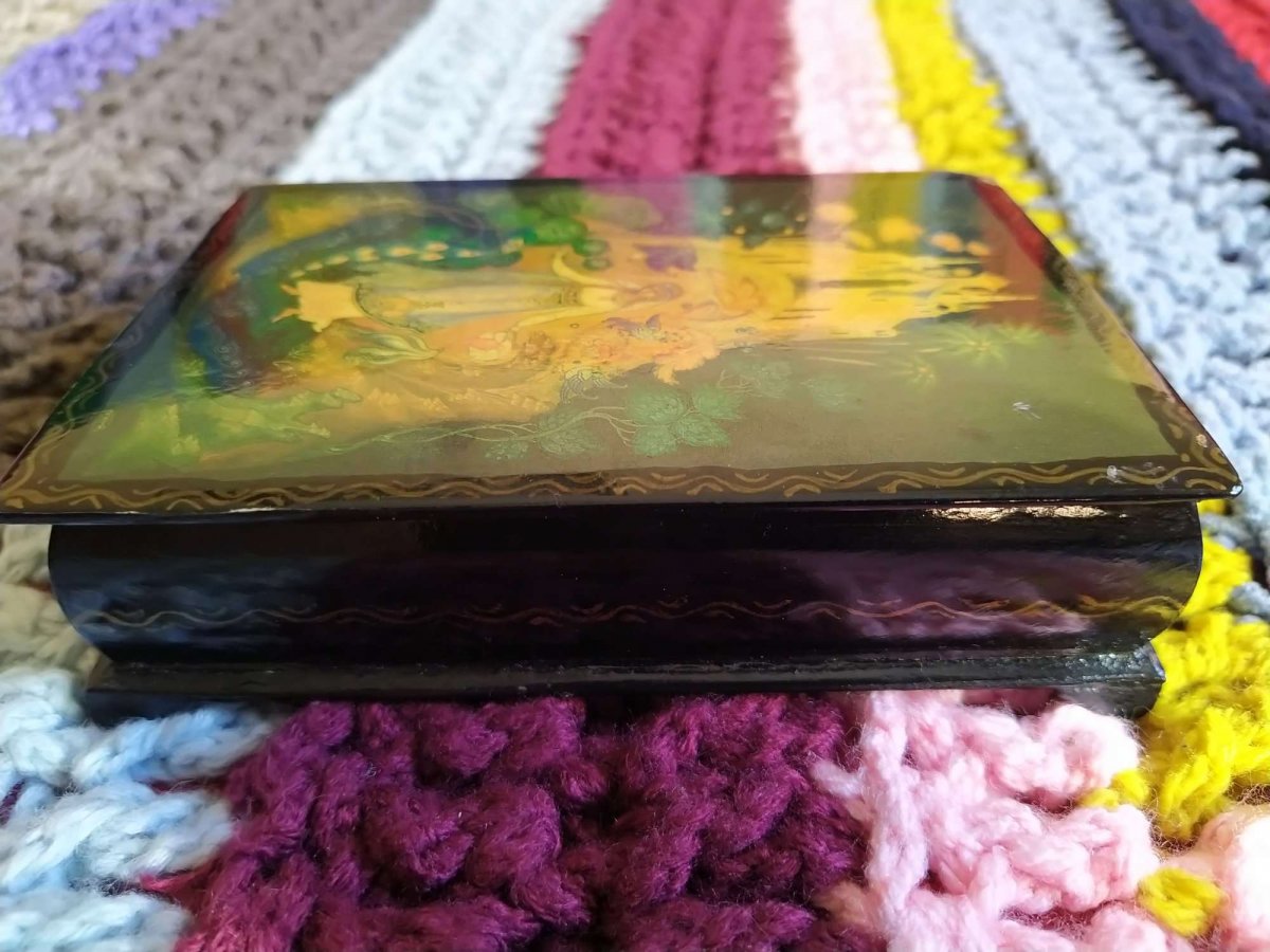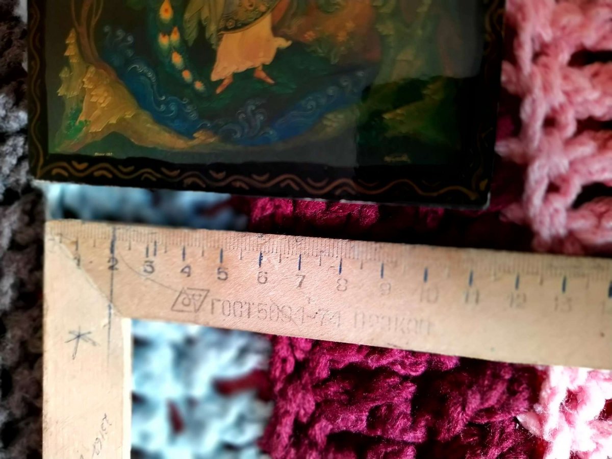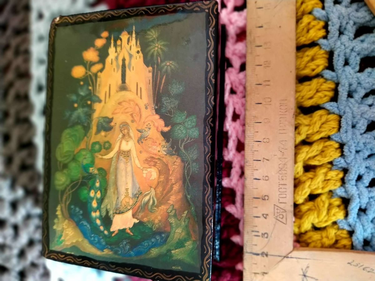 Картина на крышке нарисована маслом, шкатулка с 60 годов у одной хзяйки, не розочерован ни капельки.С Ув