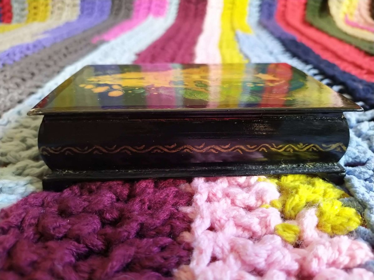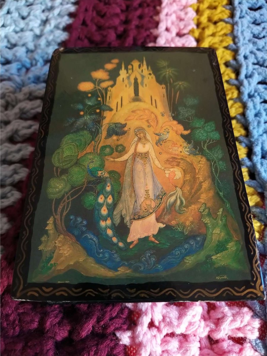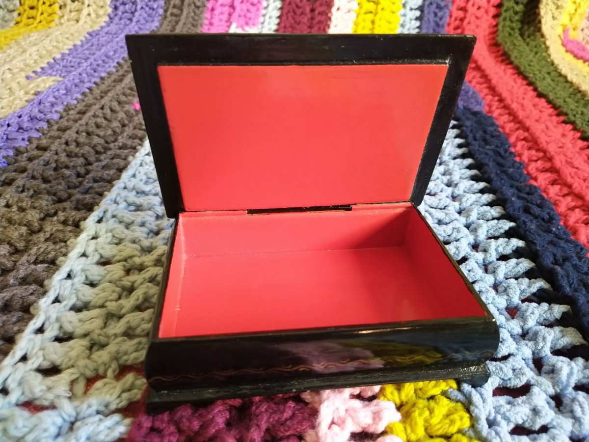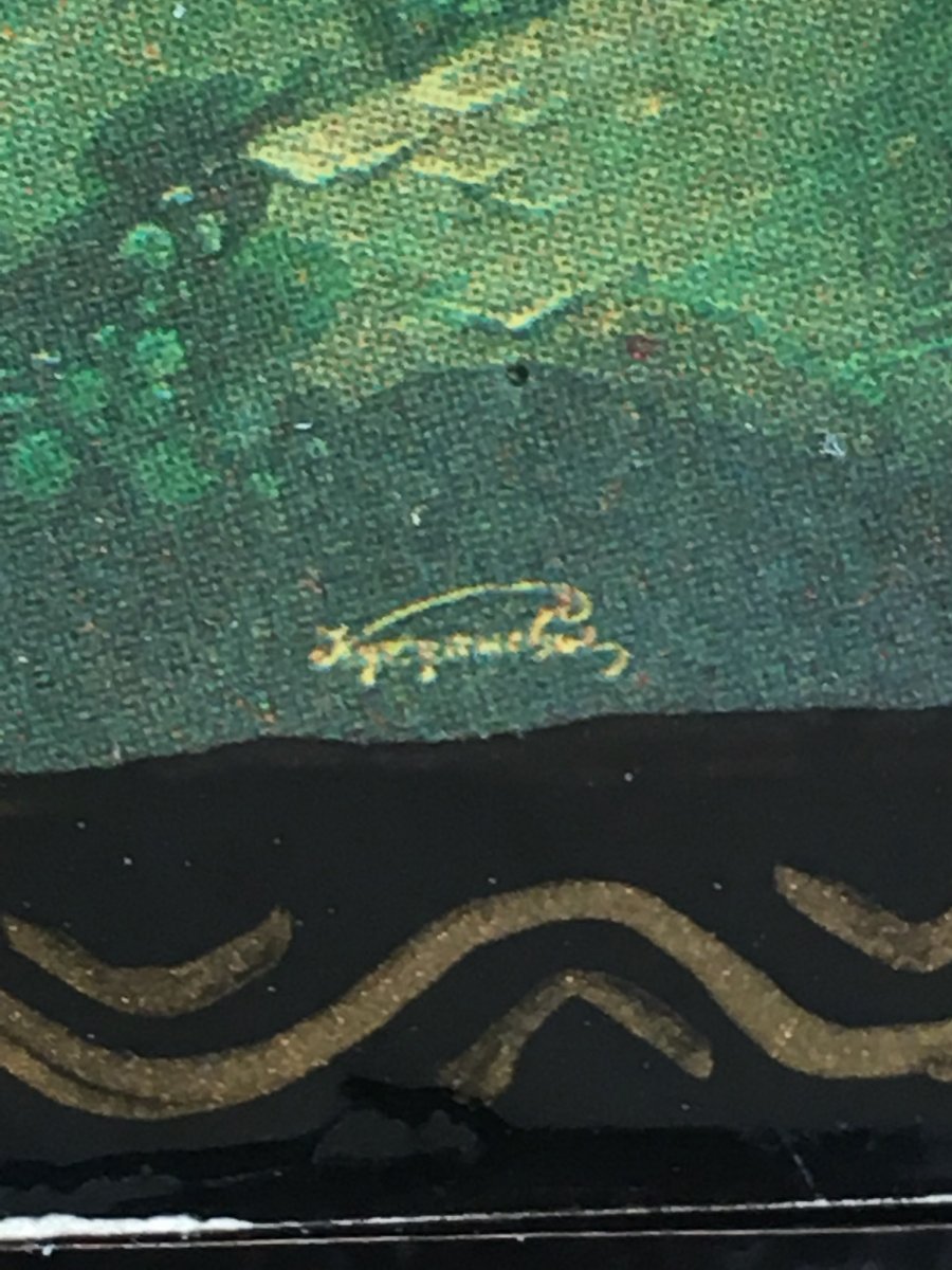 Картина на крышке нарисована маслом, шкатулка с 60 годов у одной хзяйки, не розочерован ни капельки.С Ув
