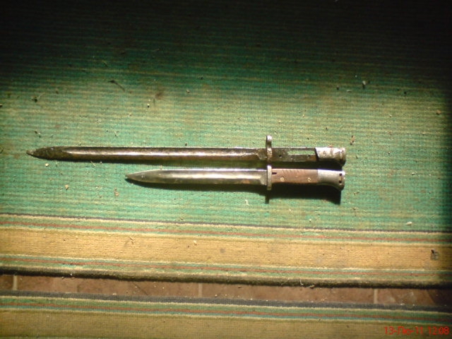 Доброго времени суток, камрады. На днях был найден вот такой вот штык, полная его длина 53 см (от конца лезвия до конца рукояти). Для сравнения рядом размещен маузеровский штык меньшего размера. Подскажите, что это за штык? С уважением.