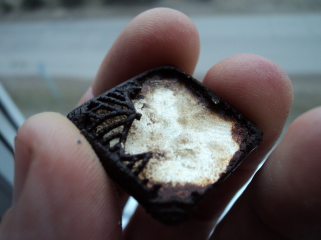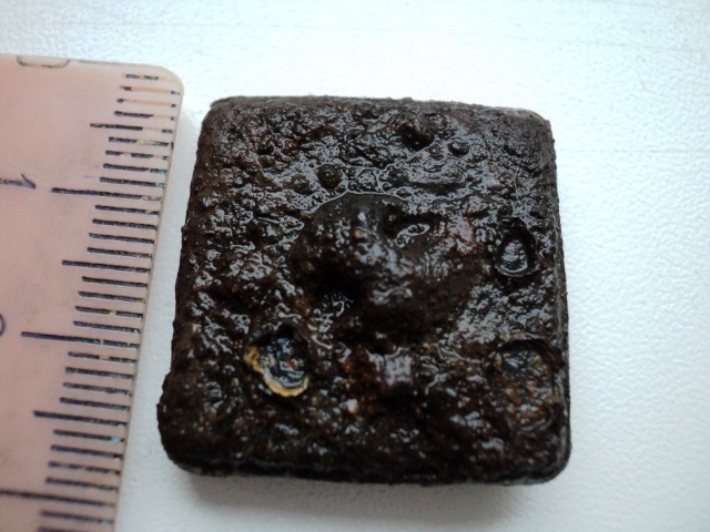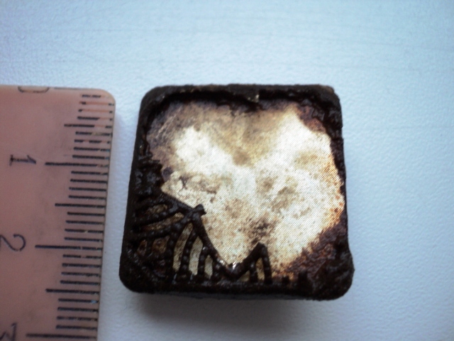 Была вся с тонким узором, но в процессе мойки тонкий узор облетел. Внешняя оболочка магнитится, белый металл нет. Может пуговица? Крепление со сквозным отверстием.