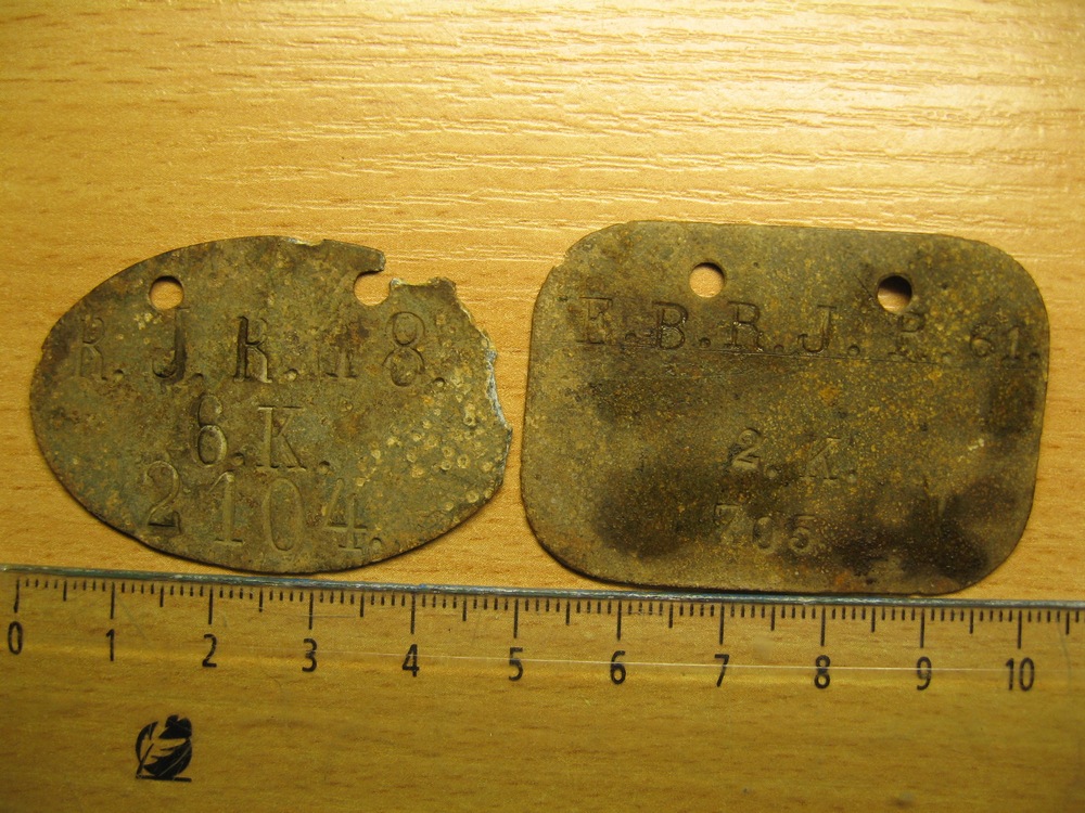 Жетоны немецких солдат на Первую мировую образца 1914 года. №1—8-ой имперский пехотный морской? полк, 6-я рота и личный номер солдата, №2—запасной батальон 61 пехотного сапёрного полка, 2-я рота и личный номер. Вроде так.