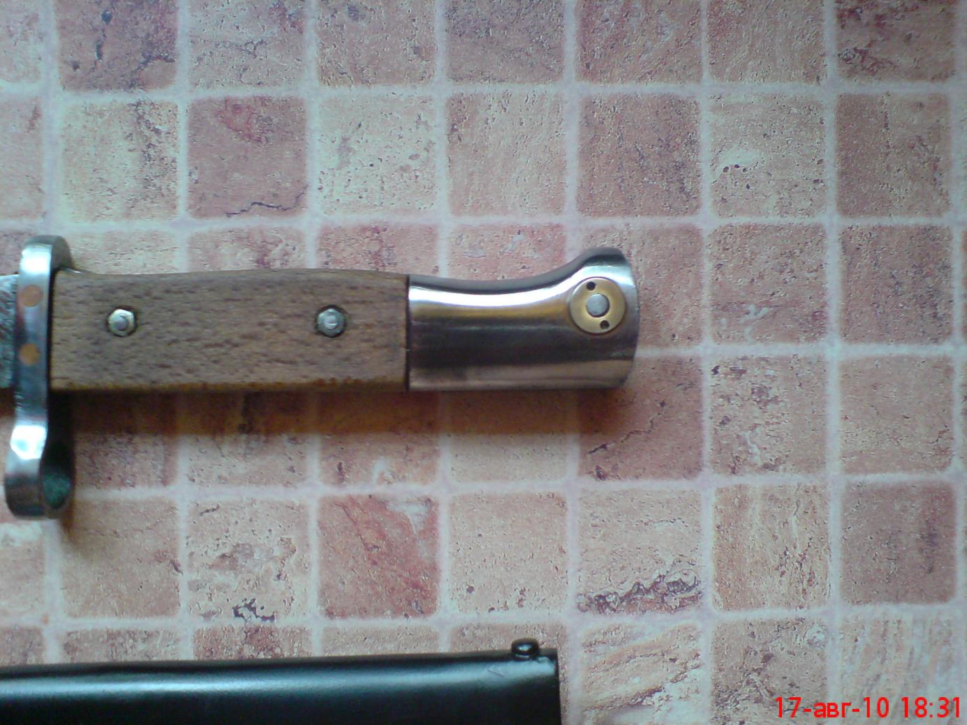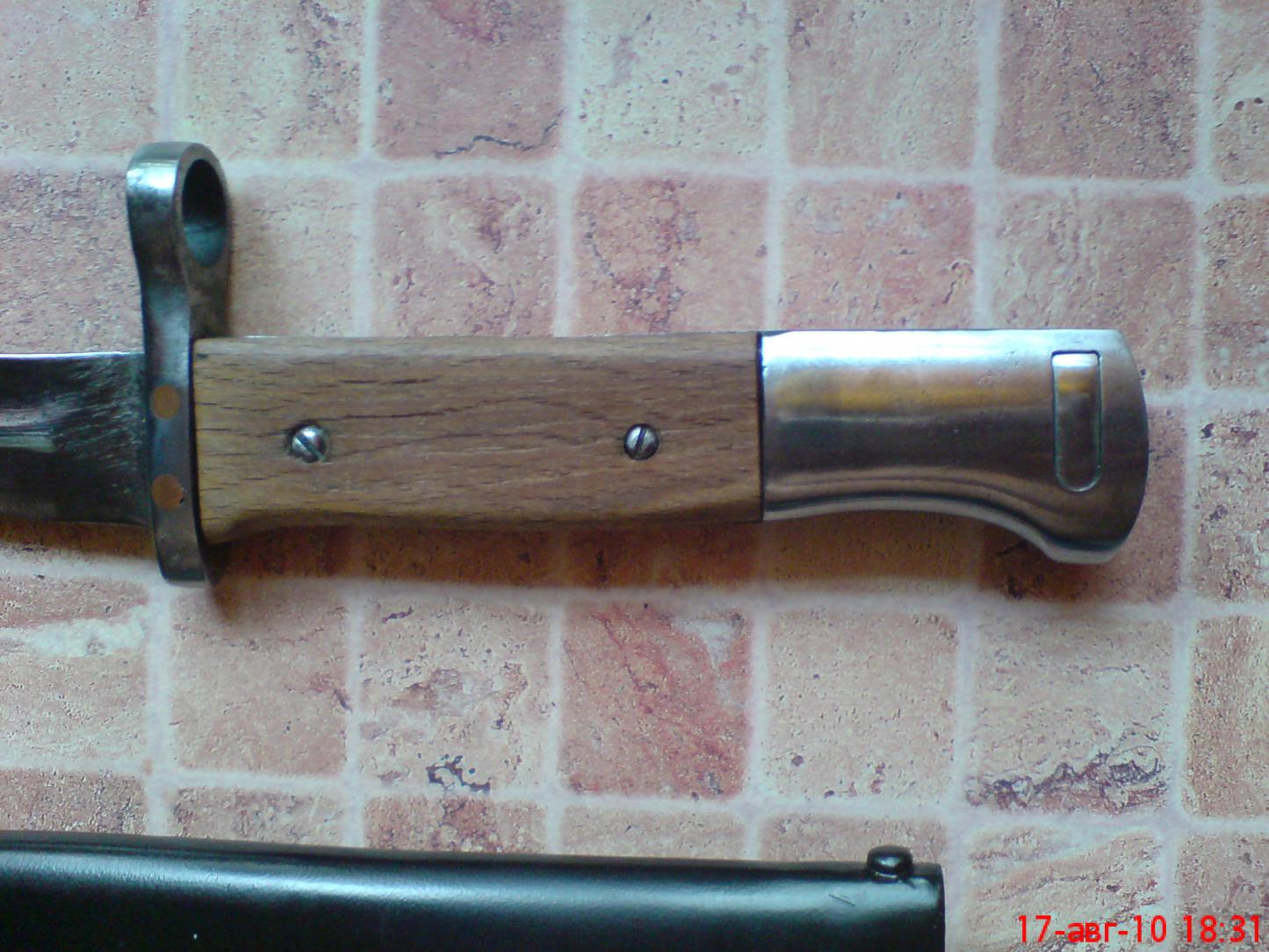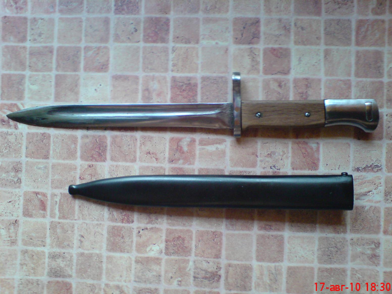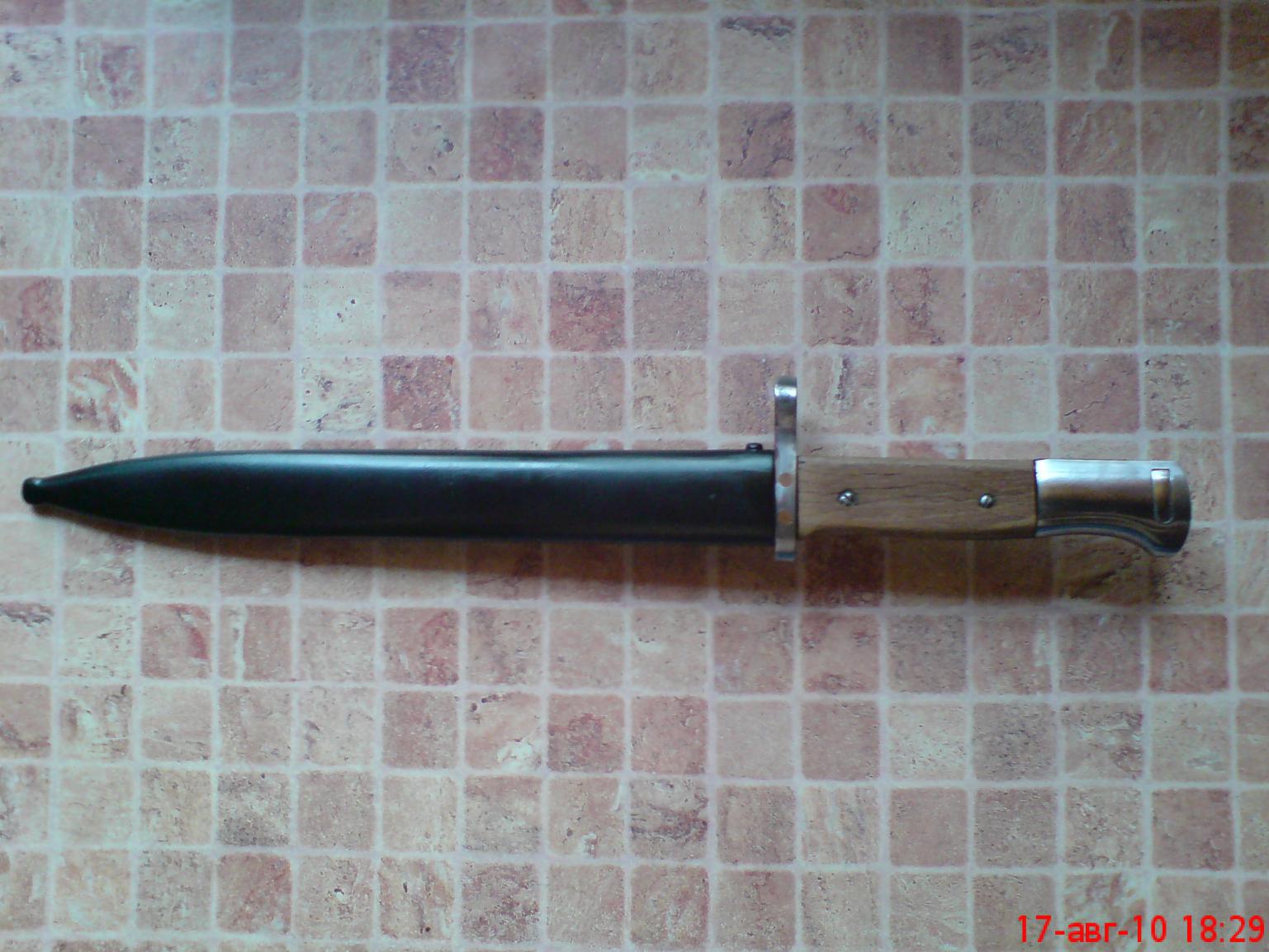 Похож на уточенный к 98к с манлихеровской гардой.Самое ценное здесь ножны,думаю грн 250-300 потянут(если прижимная пружина живая) и фиксирующая кнопка в навершии-грн 150 стоит,если пружина живая,ну а все остальное в нагрузку)))Итого грн 400-450,только из-за ножен и кнопки.