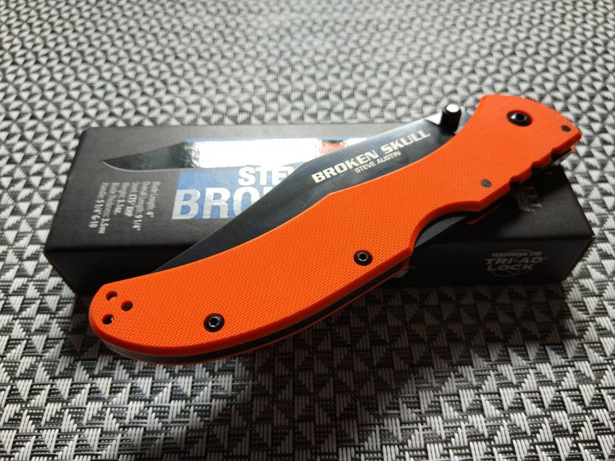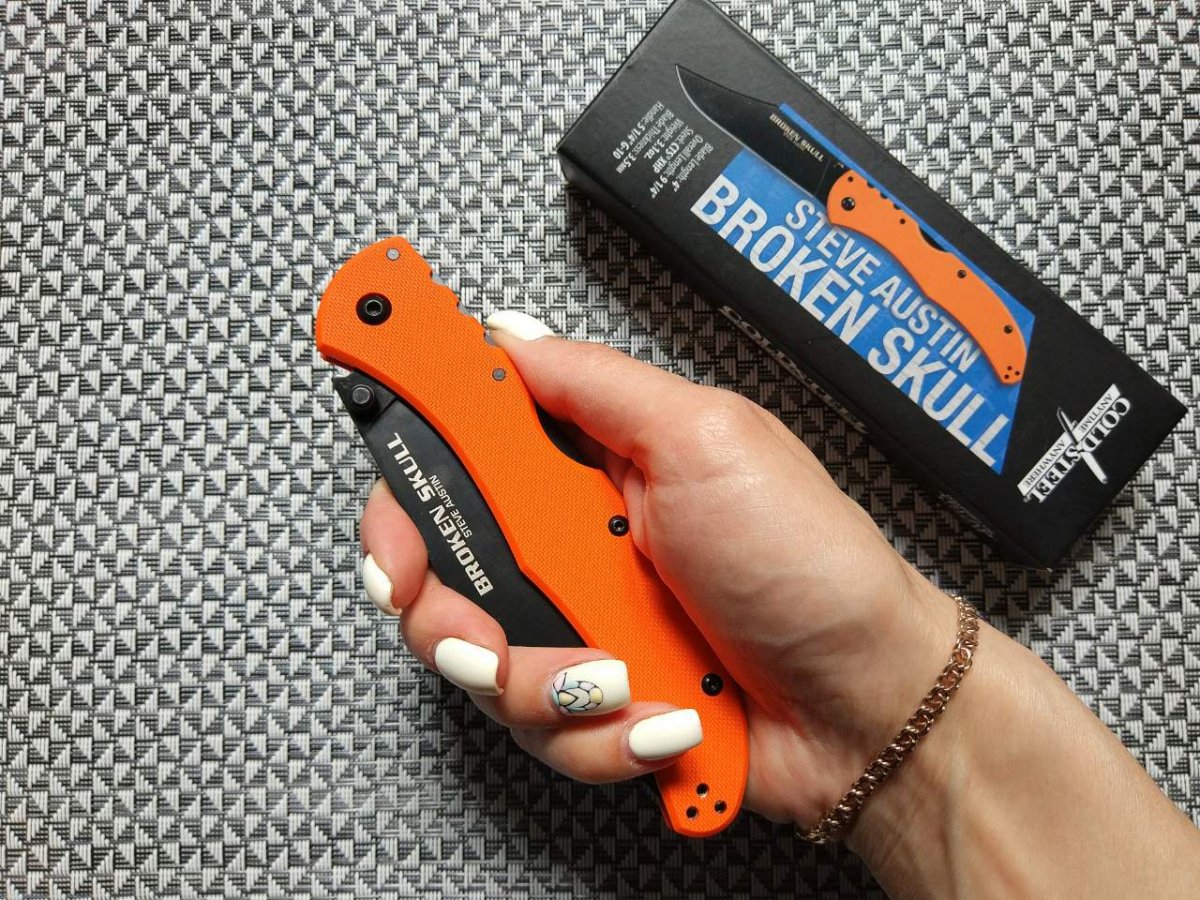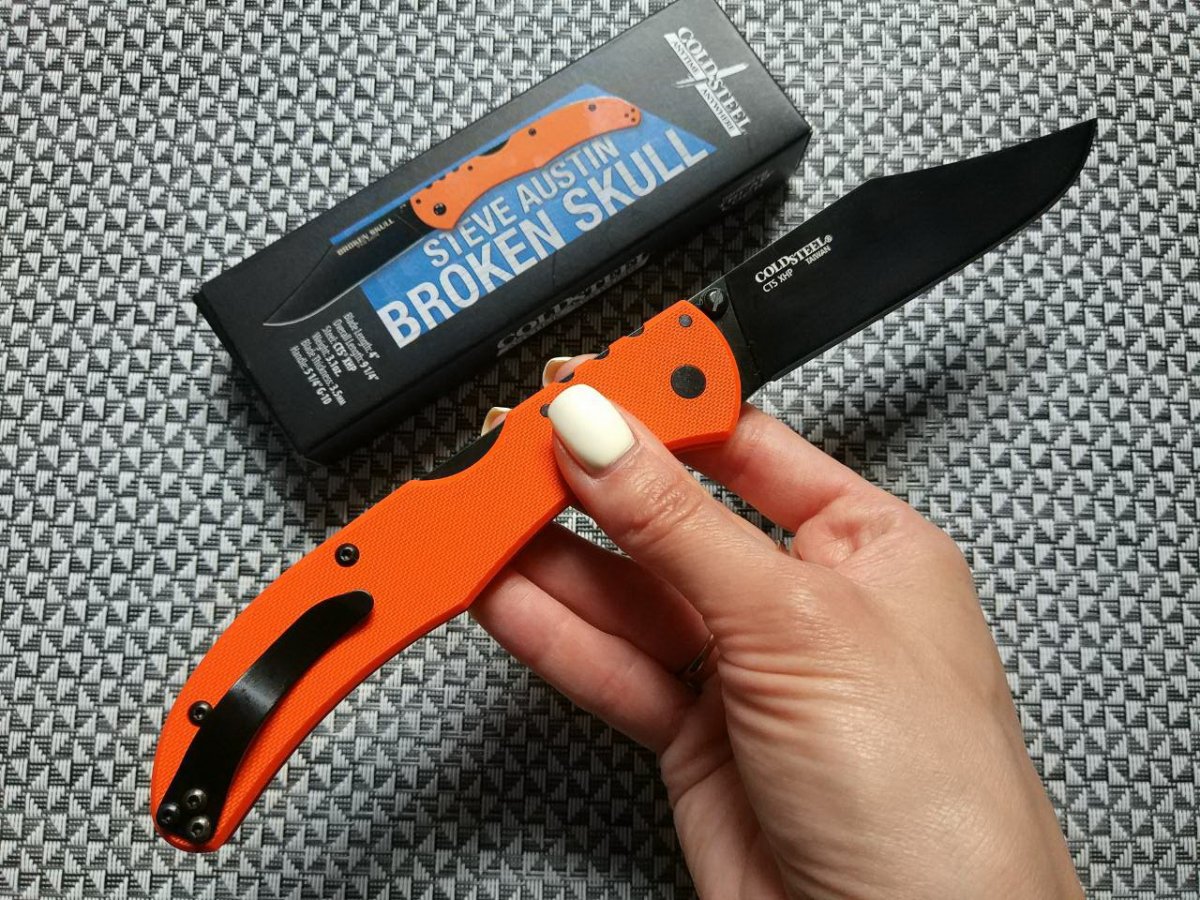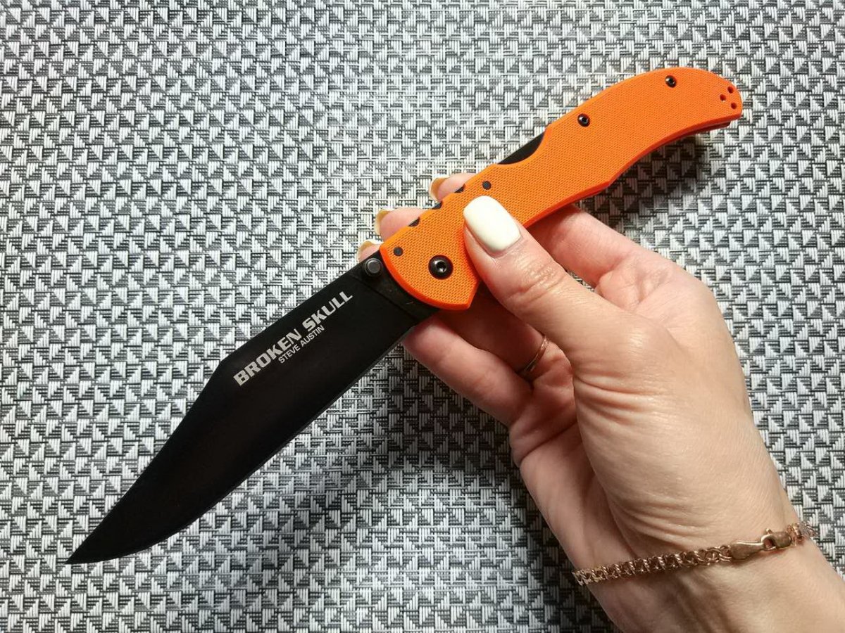 Предлагаю складной нож от компании Cold Steel (Колд Стил). Модель Broken Skull I (Orange) 54SBOR. Оригинал. Cold Steel в сотрудничестве с профессиональным рестлером, охотником и ножеманом Стивом Остином (Steve Austin) создали интересную и даже в своём роде уникальную серию ножей - Broken Skull. Это если по информации компании.… На мой же взгляд - это слегка изменённый визуально и выпущенный в гораздо более интересных материалах нож Lone Star Hunter. Но от этого эта модель хуже не стала, а компания имеет право на интересный и яркий «маркетинг», так что простительно . Нож имеет одноимённое название с состязанием на силу ловкость и выносливость Broken Skull challenge, которое проводит сам Стив. Чем же этот нож так необычен? Да взять хотя бы соотношение габаритов к весу – при длине клинка в честных 100 мм и общей длине в 235 мм, вес ножа Broken Skull Orange составляет всего 88 г, а это уже огромное преимущество. Толщина рукояти менее 1 сантиметра, при этом нож Cold Steel Broken Skull I отлично сидит в руке, он действительно удобен, разве что для серьёзной силовой работы лучше надевать перчатки. Нож Broken Skull получился действительно интересный и более чем универсальный, он с одинаковым успехом может быть EDC инструментом горожанина или верным помощником охотника. Даже в кармане костюма этот нож не станет инородным телом и способен потеснить многих конкурентов в нише джентльмен фолдеров. Cold Steel Broken Skull – нож способный удивлять. Сталь CTS-XHP, используемая для изготовления клинка Cold Steel Broken Skull Orange – выпускается американской металлургической компанией Carpenter CTS и является порошковой нержавеющей сталью премиум-класса. Для клинка Cold Steel Broken Skull Orange выполненного из стали CTS-XHP характерна высокая твёрдость и отличная коррозионная стойкость. Clip-point, или щучка по-нашему, форма исключительно удобная для многоцелевого рабочего ножа, такой профиль присущ клинку Cold Steel Broken Skull 1. Спущен клинок от обуха, рез получается агрессивный и хорошо контролируемый. Открывается клинок традиционно для Cold Steel при помощи шпеньков, как левой, так и правой рукой. Отдельно стоит отметить финишную обработку клинка. В случае с Cold Steel Broken Skull Orange это DLC – Diamond-Like Coating (алмазоподобное углеродное покрытие), очень прочное и стойкое, благодаря слоистой структуре. Помимо красоты и некоторой тактичности, покрытие DLC так же предохраняет клинок от воздействия агрессивных сред. Особенность строения рукояти ножа Broken Skull является то, что в ней нет стальных лайнеров, решение хоть и не новое, но эффективное – это значительно снижает вес всей конструкции, при сохранении достаточной прочности. Рукоять Cold Steel Broken Skull I Orange плоская с прямоугольным сечением, выполнена из G-10. Прочности накладок из этого материала более чем достаточно, чтобы рукоять ножа не играла при нагрузках и была достаточно монолитна. Ближе к клинку на спинке рукояти есть специальные выемки, создающие надёжный упор для большого пальца. Вся фурнитура, элементы замка и клипса ножа Cold Steel Broken Skull Orange чёрного цвета – создаётся приятный контраст с оранжевым цветом рукояти. Замок - Tri-Ad Lock, пожалуй, самый крепкий и мощный на сегодняшний день, он способен выдерживать огромные нагрузки, не позволяя клинку Cold Steel Broken Skull сложиться при этом и остаться полностью работоспособным. Ссылка модели на сайте производителя: http://www.coldsteel.com/products/broken-skull-1-orange.html Пара видео, от производителя: Еще несколько, для наглядности: Разнообразных 