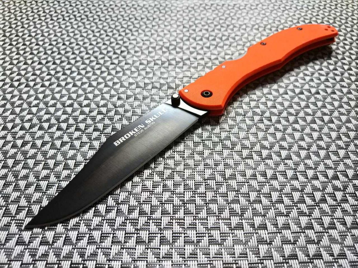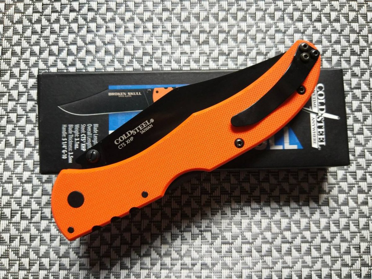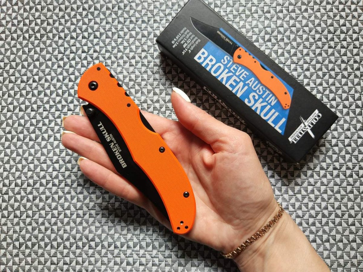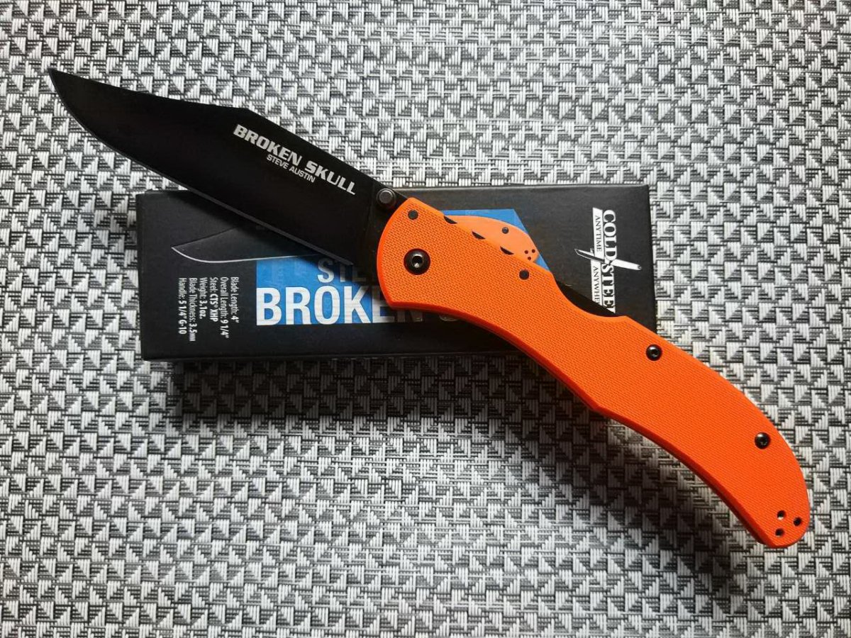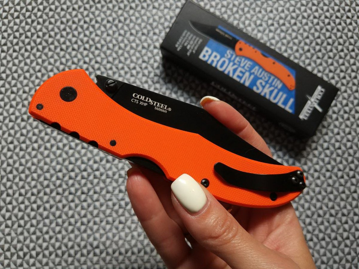 Предлагаю складной нож от компании Cold Steel (Колд Стил). Модель Broken Skull I (Orange) 54SBOR. Оригинал. Cold Steel в сотрудничестве с профессиональным рестлером, охотником и ножеманом Стивом Остином (Steve Austin) создали интересную и даже в своём роде уникальную серию ножей - Broken Skull. Это если по информации компании.… На мой же взгляд - это слегка изменённый визуально и выпущенный в гораздо более интересных материалах нож Lone Star Hunter. Но от этого эта модель хуже не стала, а компания имеет право на интересный и яркий «маркетинг», так что простительно . Нож имеет одноимённое название с состязанием на силу ловкость и выносливость Broken Skull challenge, которое проводит сам Стив. Чем же этот нож так необычен? Да взять хотя бы соотношение габаритов к весу – при длине клинка в честных 100 мм и общей длине в 235 мм, вес ножа Broken Skull Orange составляет всего 88 г, а это уже огромное преимущество. Толщина рукояти менее 1 сантиметра, при этом нож Cold Steel Broken Skull I отлично сидит в руке, он действительно удобен, разве что для серьёзной силовой работы лучше надевать перчатки. Нож Broken Skull получился действительно интересный и более чем универсальный, он с одинаковым успехом может быть EDC инструментом горожанина или верным помощником охотника. Даже в кармане костюма этот нож не станет инородным телом и способен потеснить многих конкурентов в нише джентльмен фолдеров. Cold Steel Broken Skull – нож способный удивлять. Сталь CTS-XHP, используемая для изготовления клинка Cold Steel Broken Skull Orange – выпускается американской металлургической компанией Carpenter CTS и является порошковой нержавеющей сталью премиум-класса. Для клинка Cold Steel Broken Skull Orange выполненного из стали CTS-XHP характерна высокая твёрдость и отличная коррозионная стойкость. Clip-point, или щучка по-нашему, форма исключительно удобная для многоцелевого рабочего ножа, такой профиль присущ клинку Cold Steel Broken Skull 1. Спущен клинок от обуха, рез получается агрессивный и хорошо контролируемый. Открывается клинок традиционно для Cold Steel при помощи шпеньков, как левой, так и правой рукой. Отдельно стоит отметить финишную обработку клинка. В случае с Cold Steel Broken Skull Orange это DLC – Diamond-Like Coating (алмазоподобное углеродное покрытие), очень прочное и стойкое, благодаря слоистой структуре. Помимо красоты и некоторой тактичности, покрытие DLC так же предохраняет клинок от воздействия агрессивных сред. Особенность строения рукояти ножа Broken Skull является то, что в ней нет стальных лайнеров, решение хоть и не новое, но эффективное – это значительно снижает вес всей конструкции, при сохранении достаточной прочности. Рукоять Cold Steel Broken Skull I Orange плоская с прямоугольным сечением, выполнена из G-10. Прочности накладок из этого материала более чем достаточно, чтобы рукоять ножа не играла при нагрузках и была достаточно монолитна. Ближе к клинку на спинке рукояти есть специальные выемки, создающие надёжный упор для большого пальца. Вся фурнитура, элементы замка и клипса ножа Cold Steel Broken Skull Orange чёрного цвета – создаётся приятный контраст с оранжевым цветом рукояти. Замок - Tri-Ad Lock, пожалуй, самый крепкий и мощный на сегодняшний день, он способен выдерживать огромные нагрузки, не позволяя клинку Cold Steel Broken Skull сложиться при этом и остаться полностью работоспособным. Ссылка модели на сайте производителя: http://www.coldsteel.com/products/broken-skull-1-orange.html Пара видео, от производителя: Еще несколько, для наглядности: Разнообразных 