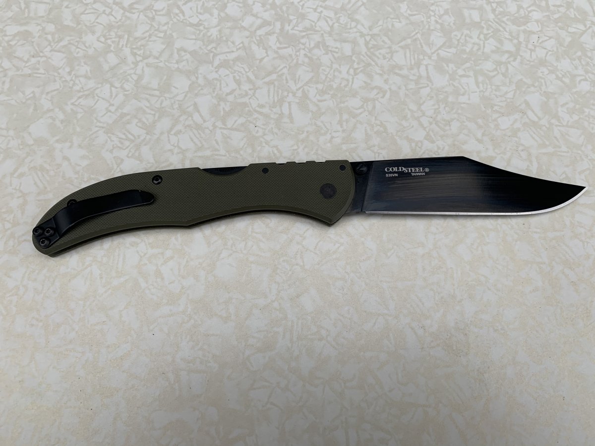 Приветствую сообщество! Предлагаю вашему вниманию нож который очень популярен у всех блогеров в 2020 году . Ему нет равных в своей ценовой категории Нож носился короткое время на кармане , особо ничего не резал . Коробки нет , клипса только правая . Состояние близкое к новому Смотрите фото Только продажа , обмен не интересует Цена Продан Оплата на карту Приватбанка Отправка Новой почтой за счёт получателя Характеристики: Общая длина: 235 мм Длина клинка: 101 мм Толщина клинка: 3,5 мм Сталь клинка: CPM S35VN Твердость клинка: 60-62 HRC Финишное покрытие: черное DLC Coating Режущая кромка: гладкая Материал рукояти: G-10 темно-зелёного цвета Механизм фиксации: Tri-Ad Lock Карманная клипса: право/лево, Tip-Up Вес: 88 г Компания производитель: Cold Steel Не является холодным оружием