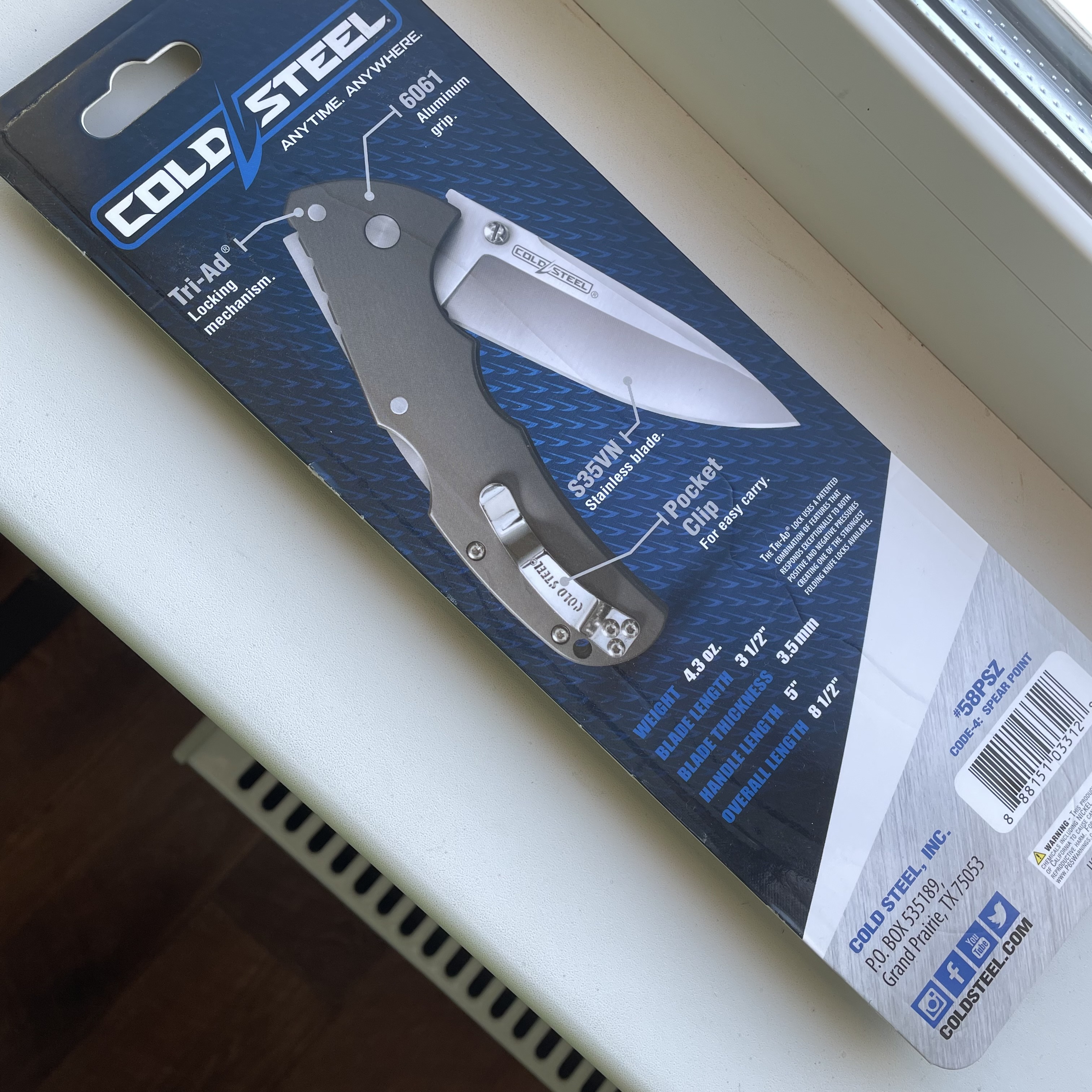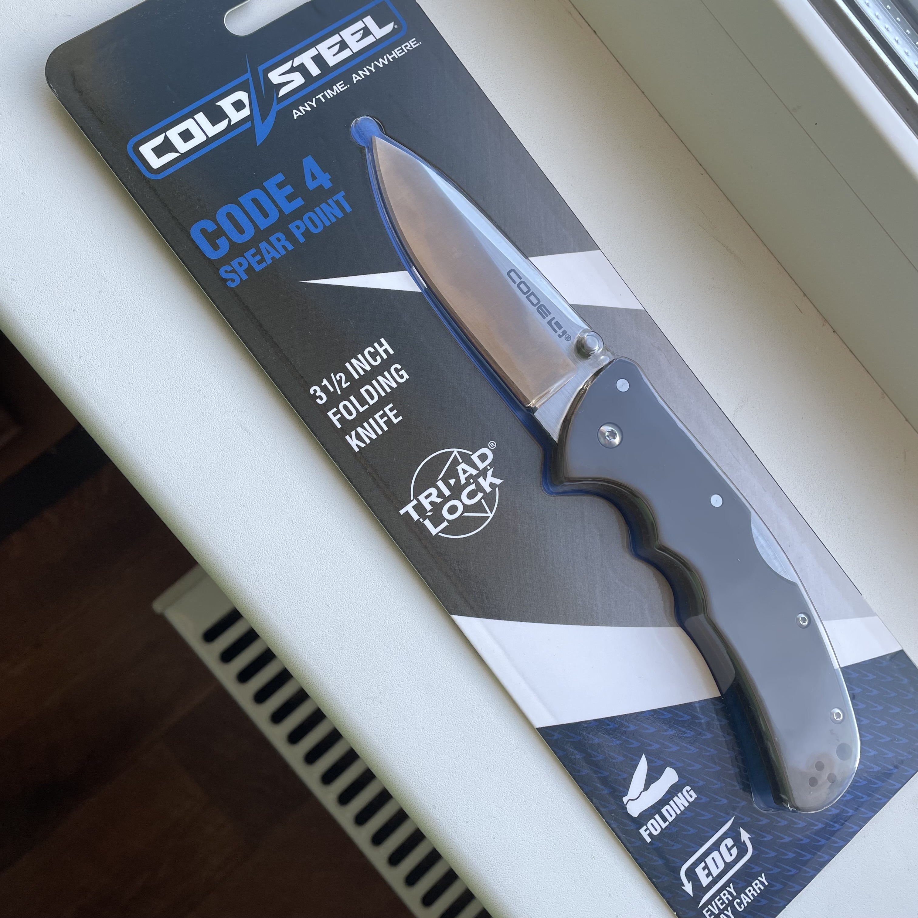 Cold Steel Code 4 Spear Point S35VN (новий в блістере) ТТХ: Ціна - 4500грн. Марка сталі - S35VN Довжина клинка - 89мм Механізм фіксації - Tri-Ad Lock Товщина клинка - 3,5 мм Матеріал руків'я - авіаційний алюміній Кліпса - переставляється Вага - 122г Країна виробник - Тайвань #ColdSteel #Code4 #S35VN
