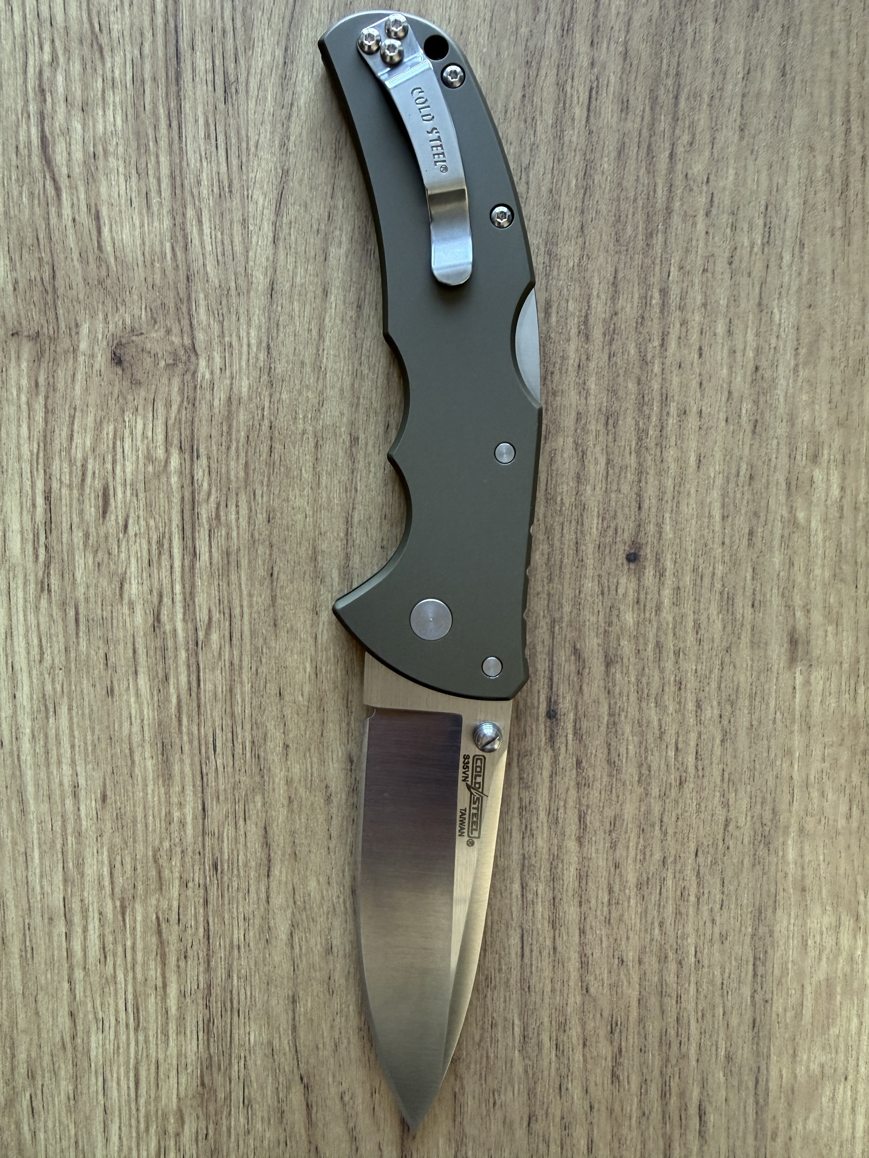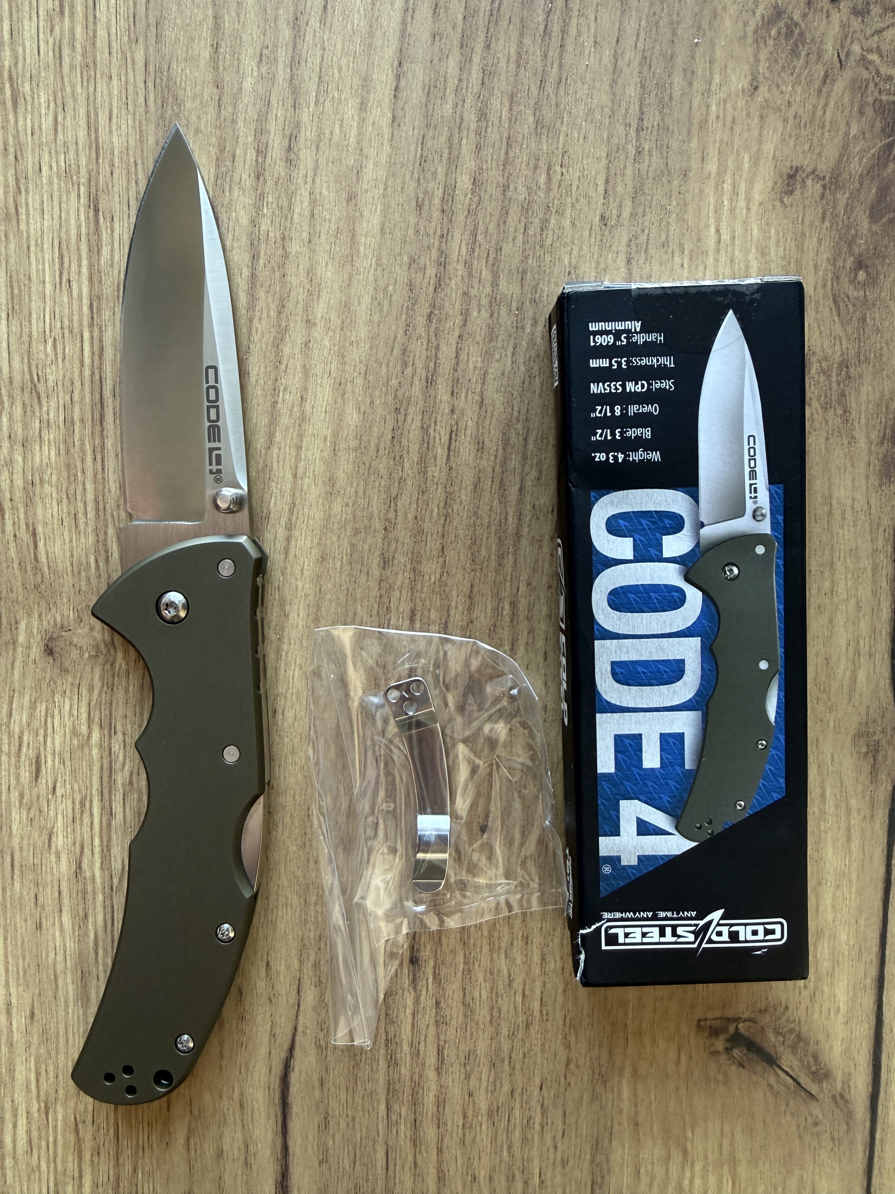 Cold Steel Code 4 Spear Point Ціна: 4000 грн Новий, діставався із коробки тільки для фото Загальна довжина: 216 мм Довжина клинка: 89 мм Товщина клинка: 3,5 мм Товщина руків’я: 9 мм Матеріал клинка: S35VN Матеріал руків’я: алюміній Замок: Tri-Ad Lock Вага: 122 г