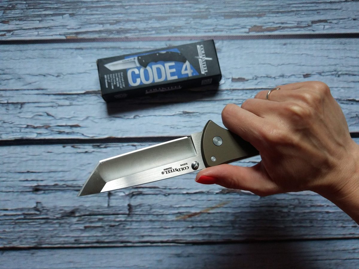 Представитель городских ножей, с премиальной сталью на клинке – нож Cold Steel Code 4 Tanto. Имея плоскую рукоять, выполненную из анодированного алюминиевого сплава, этот нож отлично вписывается в карман даже узких джинсов, да и вес в 120 г более чем приемлем для EDC инструмента. Рукоять из алюминия приятно холодит руку, её матовая поверхность качественно обработана и на удивление не стремится выскользнуть из рук. Нож симметричен - будет одинаково удобен правше и левше. Code 4 Tanto обладает отличной механикой, какие-либо люфты отсутствуют – это хороший пример бескомпромиссного качества и надёжности Cold Steel.