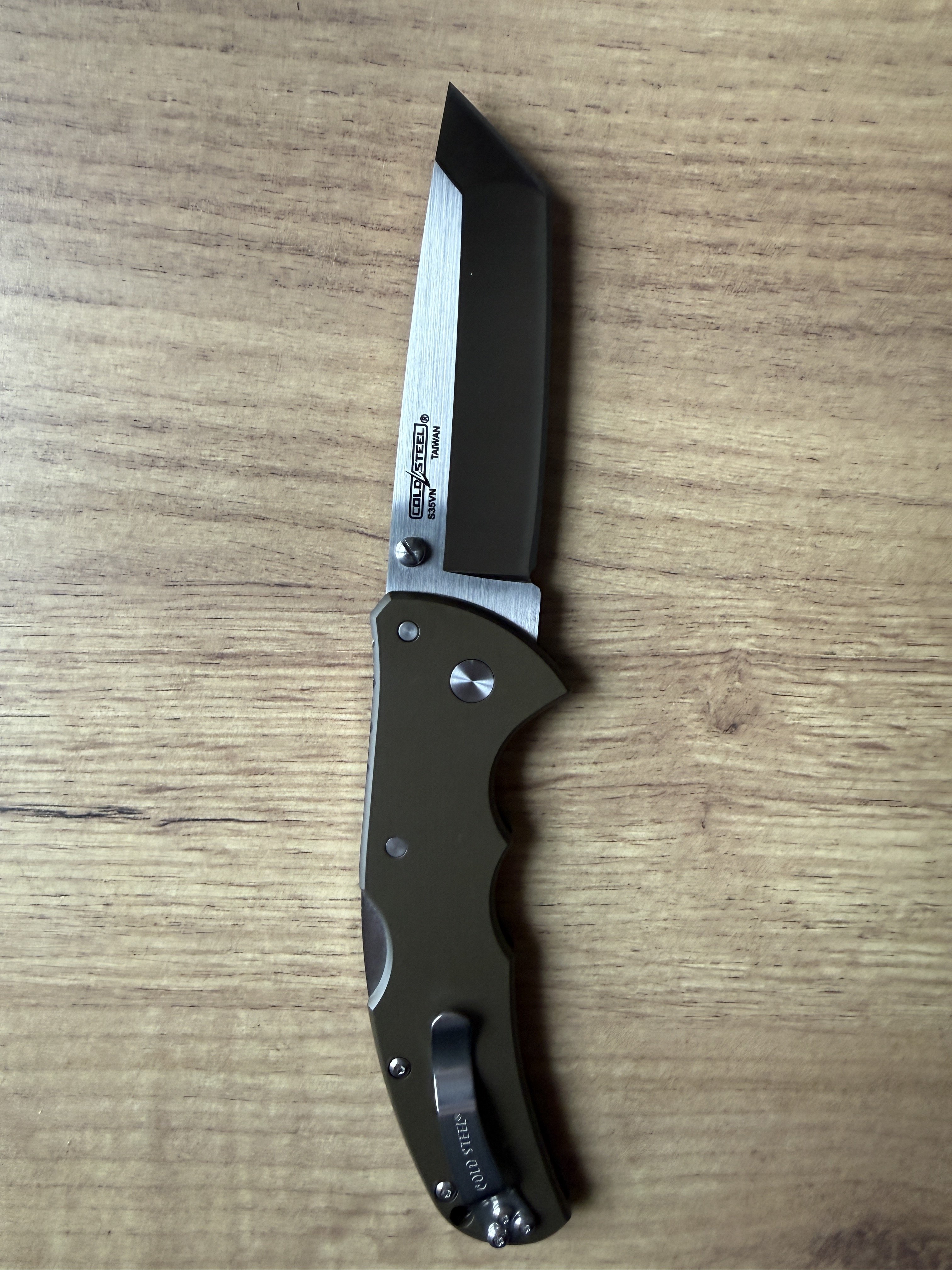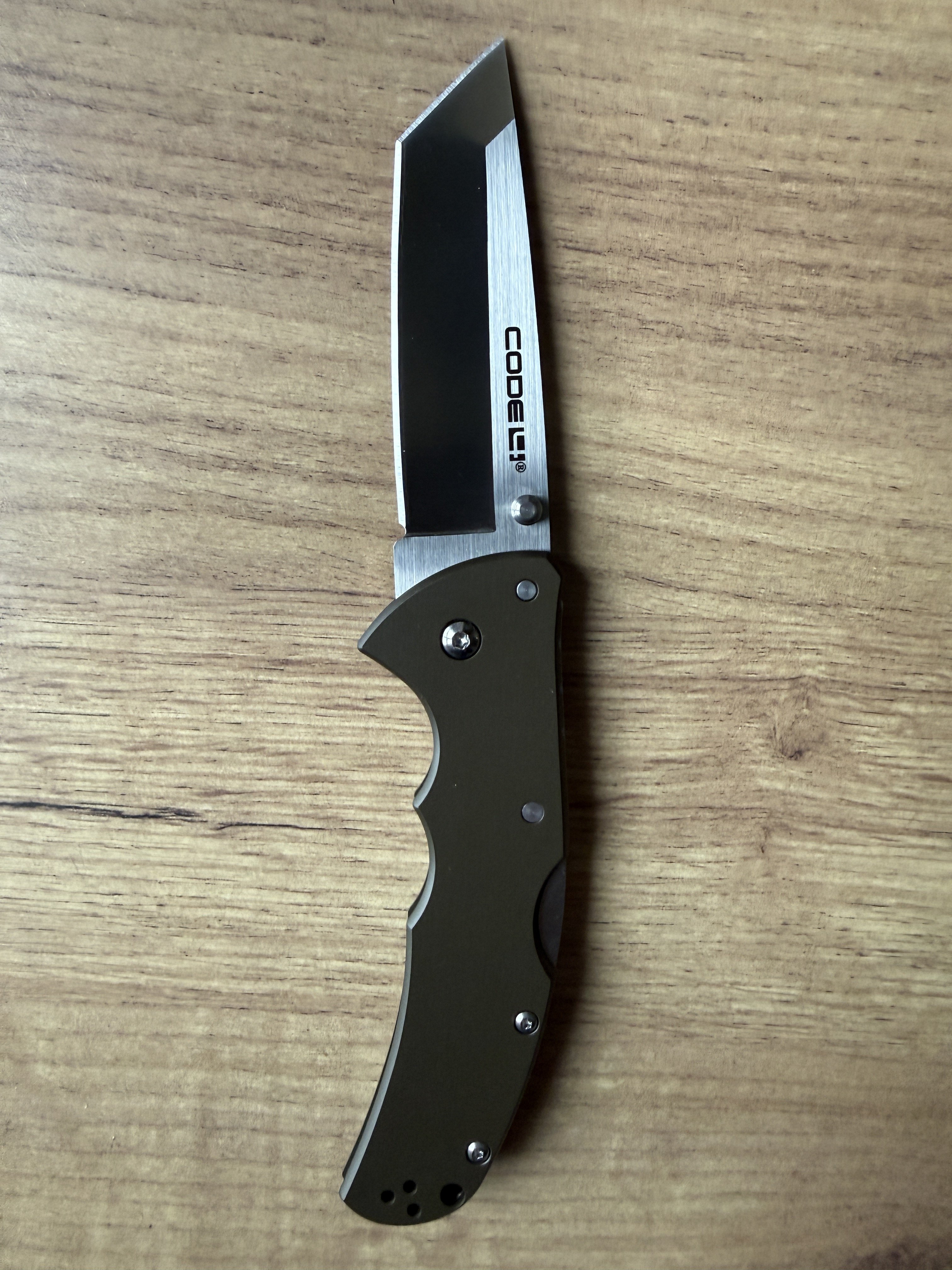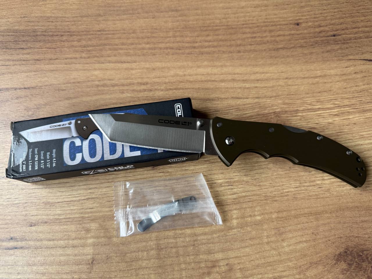 Cold Steel Code 4 Tanto Point Ціна: 4000 грн Новий, діставався із коробки тільки для фото Загальна довжина: 216 мм Довжина клинка: 89 мм Товщина клинка: 3,5 мм Товщина руків’я: 9 мм Матеріал клинка: S35VN Матеріал руків’я: алюміній Замок: Tri-Ad Lock Вага: 122