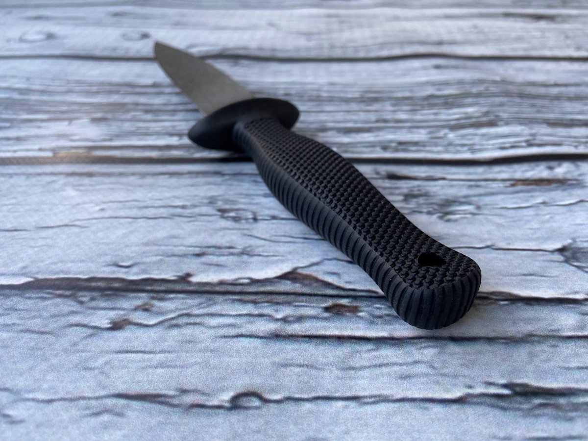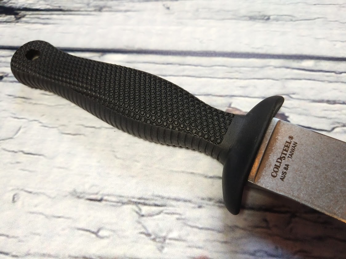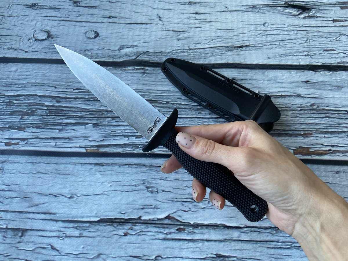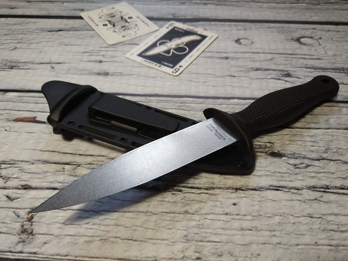 Клинок выполнен из хорошей японской стали AUS-8А, рез у ножа довольно приятный, не смотря на его «кинжальность», а максимальная толщина в 5 мм дает хороший запас прочности. Рукоять сделана из Kray-Ex™, даже в мокрых руках этот материал обеспечивает уверенный, надежный и комфортный хват. Пластиковые ножны Secure-Ex® неприхотливы в использовании, легко моются и довольно удобны.