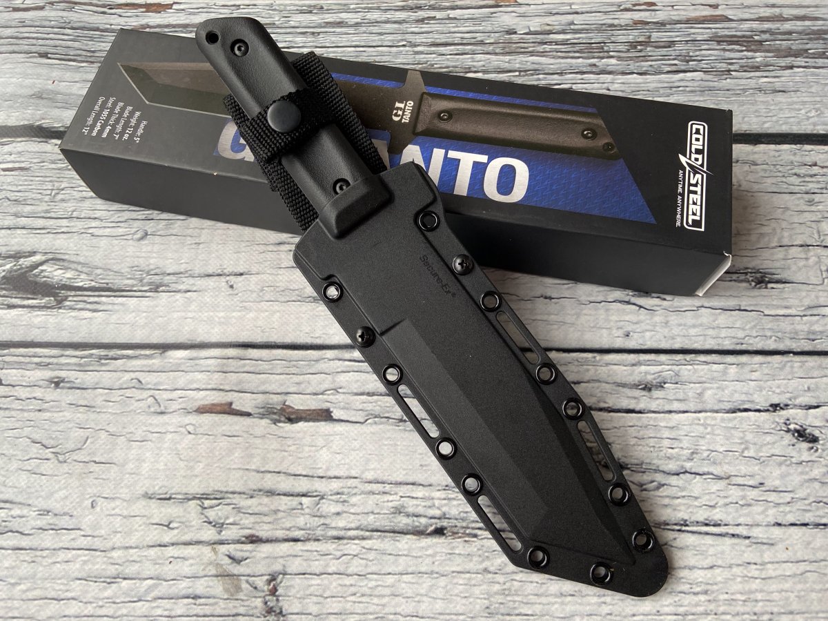 Предлагаю нож с фиксированным клинком от компании Cold Steel (Колд Стил). Модель G.I. Tanto (80PGTK). Оригинал. Обычных и не совсем обычных описаний по этой модели огромное множество, поэтому написать что-то новое «от себя» довольно затруднительно. Поэтому давайте взглянем на этот нож немного с другой стороны… Иногда нужен не просто нож, а нужно суровое рубило за вменяемые деньги. Причем рубило такое, в котором можно быть уверенным в абсолютно любой ситуации. И при таком раскладе Cold Steel GI Tanto именно то, что нужно!) Это апофеоз простоты и суровости. Вообще это нож армии Мордора. Черный, угловатый, большой и страшный. Фактически это кусок железа весом за треть килограмма, с пластиковой рукоятью на винтах. Это именно суровое «рубилово/пырялово», причем не просто суровое, но еще и мрачное. И в этом есть свое обаяние. Вообще нож транслирует эту суровость всем своим видом. Начиная от габаритов, заканчивая толщиной черного покрытия и самой своей конструкцией. И в этом всем он абсолютно самодостаточен. Он не пытается никак заигрывать с потенциальным владельцем. В полумраке у него можно даже не заметить режущую кромку и просто принять его за кусок железа причудливой формы. Он прост, как лом. Что? При рубке корней попался камень? Дзынь, пренебречь, вальсируем. Попался гвоздь при рубке доски? Ну, так возьмите полено, постучите по нему посильнее, если вы уж настолько не в себе. Потом только пройдитесь каким-нибудь бруском по жестче. Клинку ничего не будет, затупится немного, но это ничего страшного, поправите, и будет как новый. Как новый? Ну да, наверное, орочьи клинки те так вообще ржавыми вставали на вооружение, и ничего. Точно так же и здесь. Даже покрытие с него сходит и то с трудом. Нагрузки не снимают его хлопьями (чем порой грешат некоторые CS) а проделывают в нем суровые и ощутимые пальцами борозды. Рукоять простая и примитивная. Ножом можно работать и голой рукой, но лучше всего все-таки в перчатке, потому как накладки полипропиленовые и через это достаточно скользкие (хотя опять-таки «мяса» на них с огромным запасом и можно самому нанести удобную «насечку»). А в перчатках никаких проблем. А если накладки сломаются, то опять же, пренебречь, вальсируем. Намотайте паракорд, металлический трос, да хоть деревяшки на клей посадите, все что угодно будет смотреться на этом ноже уместно и органично. Этот нож прощает. Хотя нет, он не прощает, он просто не обращает внимания на любые повреждения, пока не сломается пополам. Через это в нем нет ни грамма эргономики. Поймите правильно, нож удобный, но глядя на него, слово эргономичность с визгом убегает в глухие леса. Вся эргономичность в нем связана исключительно с ножнами Secure-Ex, то есть на фоне самого ножа они выглядят очень удобными и эргономичными, со всеми своими штатными достоинствами и недостатками. В этом ноже кроется еще один любопытный момент. Дело в том, что, согласно заявлениям Cold Steel сталь Carbon 1055 на данном ноже калится по максимуму. И при этом сломать нож реально сложно (что подтверждается огромным количеством тестов и отзывов) он просто работает. У многих возникает вопрос: «А зачем он такой нужен?» Да, он может быть боевым, может быть армейским, может быть бивачным ножом. Но в целом, на мой взгляд, это в полном смысле этого слова нож выживания. Только без всех этих модных пилок, хранилищ в рукояти и компаса на затыльнике.