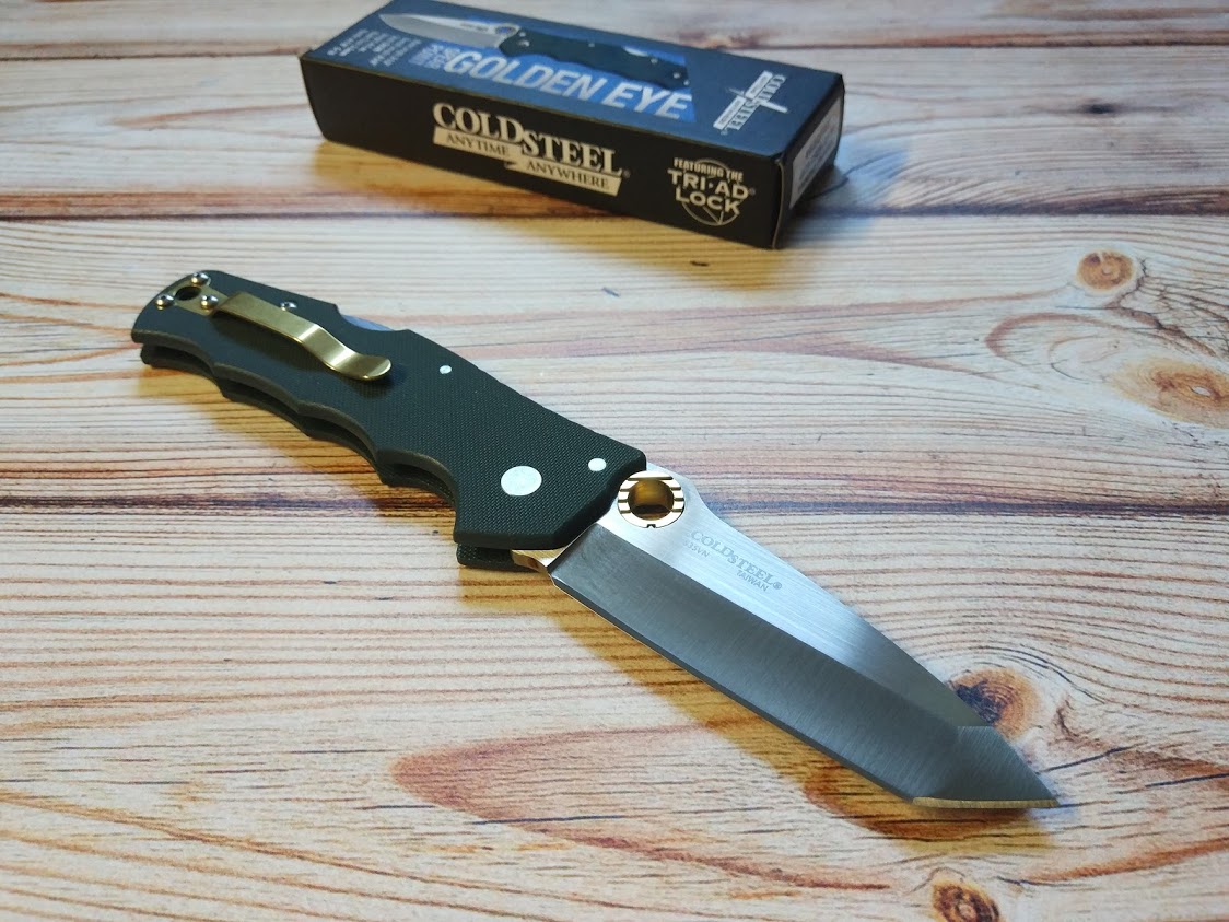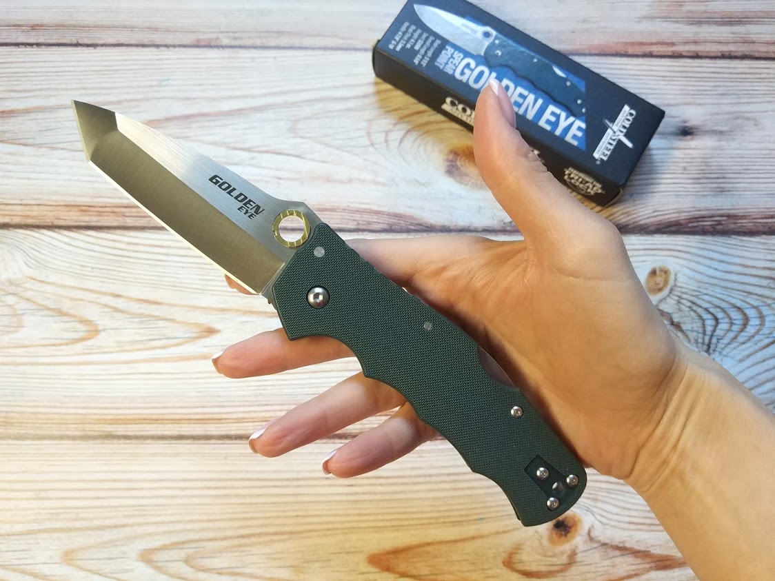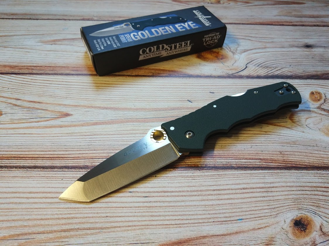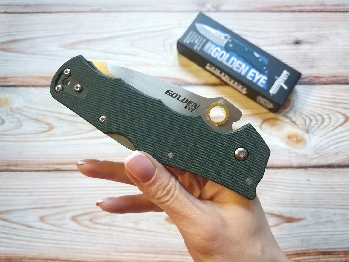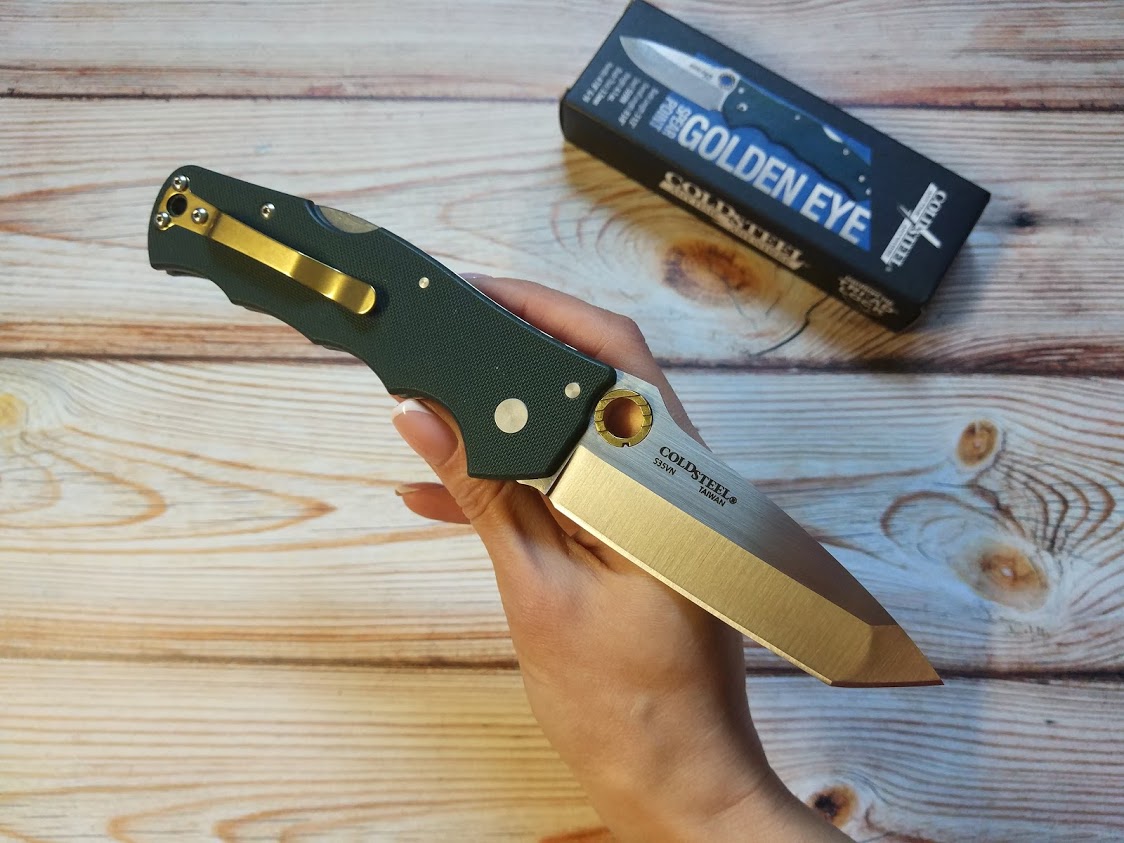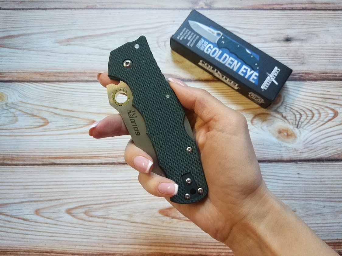 Предлагаю складной нож от компании Cold Steel (Колд Стил). Модель Golden Eye Tanto (62QFGT) CPM S35VN. Оригинал. Конкуренция в нише складных ножей среднего размера с ценником в средней (для США) и выше (для наших реалий) год от года становится всё более жесткой. Производители стараются реализовать новые идеи. Воплощением такой вот новой идеи и является нож Cold Steel Golden Eye Tanto Point. Немного непривычный для Cold Steel дизайн – дело вкуса, но то, что этот нож привлекает внимание - бесспорно. Главной особенностью, благодаря которой нож обрёл имя Golden Eye является втулка из жёлтого металла размещённая в подпальцевом отверстии клинка, такое решение оказалось удобным и оригинальным. Нож Golden Eye Tanto это городской EDC с премиальной сталью на клинке, привлекательной внешностью и приличным запасом прочности (на всякий случай). Нож оставляет впечатление законченного инструмента с удобной рукоятью и рабочим клинком готовым на многое. Порошковая коррозионностойкая сталь премиум класса CPM-S35VN использована как материал для клинка Cold Steel Golden Eye Spear Point. Сталь CPM-S35VN выпускается компанией Crucible Industries (USA), является улучшенным вариантом CPMS30V. Сталь CPM-S35VN стабильная и однородная, к её разработке приложил руку известный ножевой дизайнер Крис Рив. За счёт наличия карбидов ниобия S35VN имеет повышенные прочностные свойства, более устойчива к выкрашиванию режущей кромки и отлично держит заточку. Ещё одним несомненным плюсом стали CPM-S35VN является то, что клинок, выполненный из неё, относительно просто поддается правке и заточке. Танто-клинки от Cold Steel пробивные и зло-резучие – это ни для кого не секрет и нож Golden Eye Tanto не стал исключением. Прочнейшее острие способно выдержать серьёзные нагрузки, а вогнутые спуски от середины позволят резать различные материалы агрессивно и с удовольствием. Втулка из жёлтого металла интегрированная в отверстие клинка Cold Steel Golden Eye Tanto Point имеет специальные ступеньки для зацепа пальца при открытии клинка. И надо сказать зацеп за счёт такого исполнения получается отличный – раскрытие происходит контролируемо и чётко. Подъём обуха, перетекающий в подъём рукояти образует удобный упор для большого пальца. Финишная обработка клинка Cold Steel Golden Eye Tanto – приятный мелкий сатин. У Cold Steel получилось сделать относительно тонкую рукоять прямоугольного сечения невероятно удобной. Лучше всего нож Golden Eye будет себя чувствовать в крупной или средней руке. «Наждачная» мелкая фактура очень приятная на ощупь и намертво удерживает пальцы на своих местах. Золотой цвет довольно крупной клипсы приятно контрастирует и умело оттеняет насыщенный тёмно-зелёный цвет плашек из качественного G-10. Установить клипсу можно только в положении tip up на правой или левой стороне рукояти. Отверстие для темляка пронзает золотую клипсу и позволяет без усилий продеть в отверстие 5 мм паракорд. Традиционно для Cold Steel в конструкции ножа Golden Eye Spear Point применён их знаменитый замок Tri-Ad Lock. Думаю, каждый наслышан о его надёжности и несокрушимости – тот случай, когда это не просто слова. Ссылка модели на сайте производителя: https://www.coldsteel.com/golden-eye-tanto.html Видео от производителя: Ещё парочка для наглядности: Обзоров и видео по этой модели в сети уже довольно много, желающие могут дополнительно поискать-посмотреть. Характеристики, заявленные производителем: Длина клинка: 88,9 мм. Общая длина: 212,73 мм. Толщина клинка: 3,5 мм. М