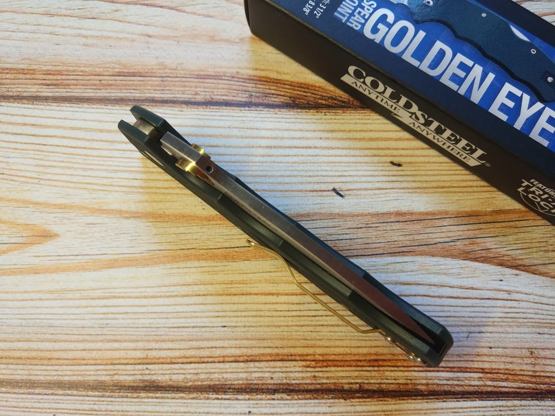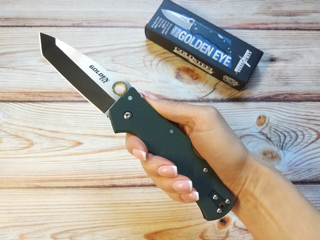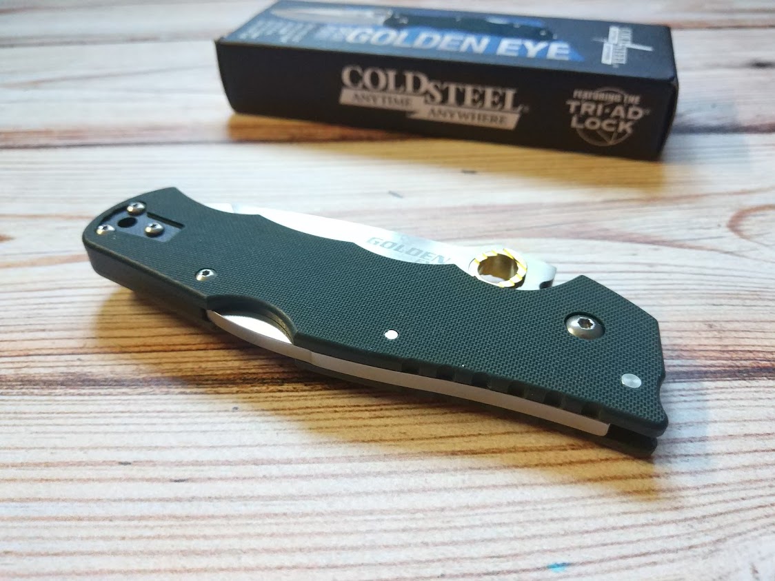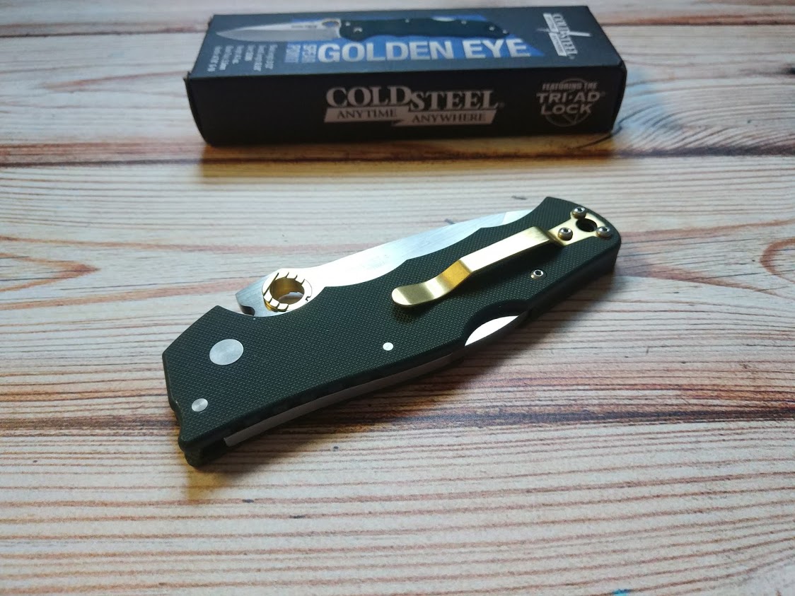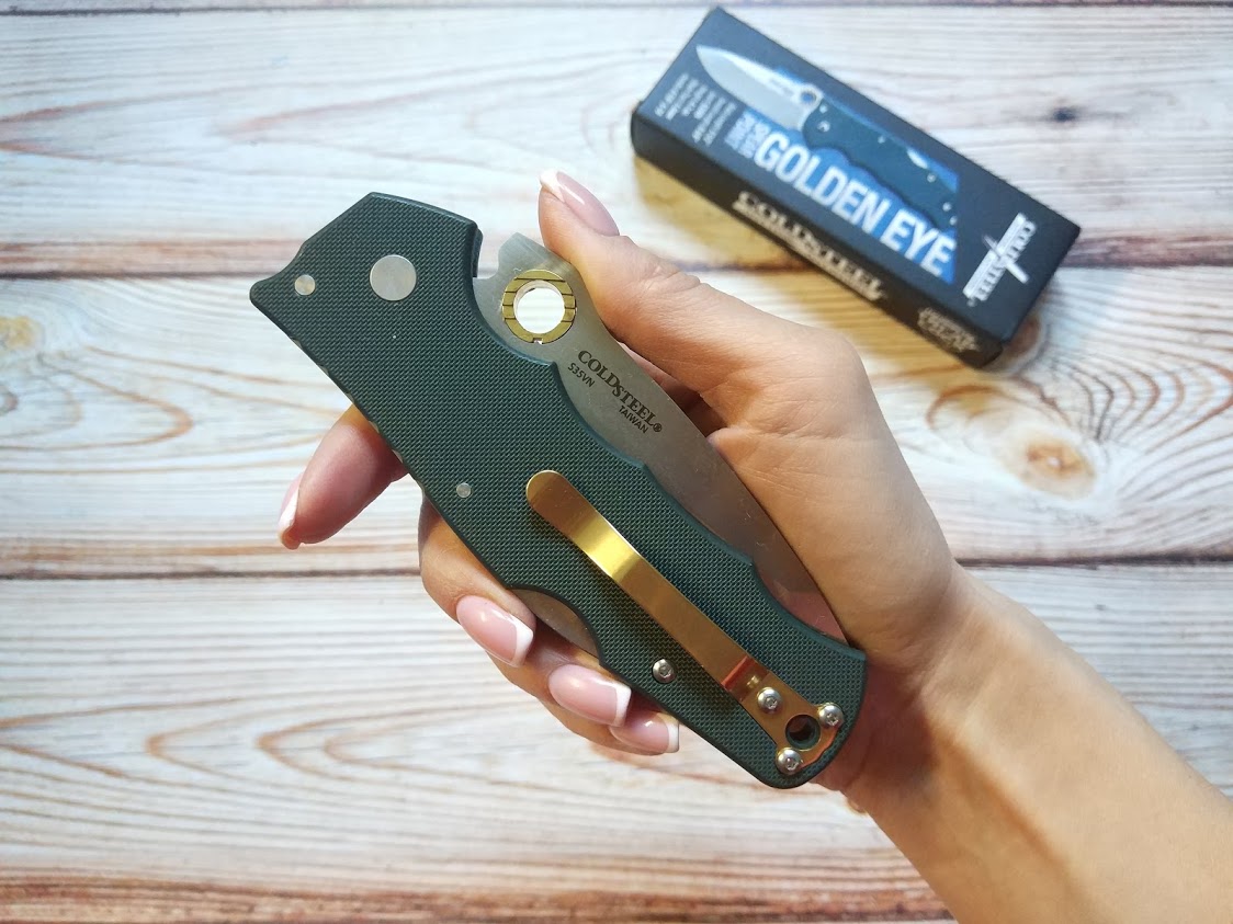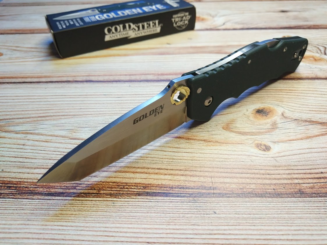 Предлагаю складной нож от компании Cold Steel (Колд Стил). Модель Golden Eye Tanto (62QFGT) CPM S35VN. Оригинал. Конкуренция в нише складных ножей среднего размера с ценником в средней (для США) и выше (для наших реалий) год от года становится всё более жесткой. Производители стараются реализовать новые идеи. Воплощением такой вот новой идеи и является нож Cold Steel Golden Eye Tanto Point. Немного непривычный для Cold Steel дизайн – дело вкуса, но то, что этот нож привлекает внимание - бесспорно. Главной особенностью, благодаря которой нож обрёл имя Golden Eye является втулка из жёлтого металла размещённая в подпальцевом отверстии клинка, такое решение оказалось удобным и оригинальным. Нож Golden Eye Tanto это городской EDC с премиальной сталью на клинке, привлекательной внешностью и приличным запасом прочности (на всякий случай). Нож оставляет впечатление законченного инструмента с удобной рукоятью и рабочим клинком готовым на многое. Порошковая коррозионностойкая сталь премиум класса CPM-S35VN использована как материал для клинка Cold Steel Golden Eye Spear Point. Сталь CPM-S35VN выпускается компанией Crucible Industries (USA), является улучшенным вариантом CPMS30V. Сталь CPM-S35VN стабильная и однородная, к её разработке приложил руку известный ножевой дизайнер Крис Рив. За счёт наличия карбидов ниобия S35VN имеет повышенные прочностные свойства, более устойчива к выкрашиванию режущей кромки и отлично держит заточку. Ещё одним несомненным плюсом стали CPM-S35VN является то, что клинок, выполненный из неё, относительно просто поддается правке и заточке. Танто-клинки от Cold Steel пробивные и зло-резучие – это ни для кого не секрет и нож Golden Eye Tanto не стал исключением. Прочнейшее острие способно выдержать серьёзные нагрузки, а вогнутые спуски от середины позволят резать различные материалы агрессивно и с удовольствием. Втулка из жёлтого металла интегрированная в отверстие клинка Cold Steel Golden Eye Tanto Point имеет специальные ступеньки для зацепа пальца при открытии клинка. И надо сказать зацеп за счёт такого исполнения получается отличный – раскрытие происходит контролируемо и чётко. Подъём обуха, перетекающий в подъём рукояти образует удобный упор для большого пальца. Финишная обработка клинка Cold Steel Golden Eye Tanto – приятный мелкий сатин. У Cold Steel получилось сделать относительно тонкую рукоять прямоугольного сечения невероятно удобной. Лучше всего нож Golden Eye будет себя чувствовать в крупной или средней руке. «Наждачная» мелкая фактура очень приятная на ощупь и намертво удерживает пальцы на своих местах. Золотой цвет довольно крупной клипсы приятно контрастирует и умело оттеняет насыщенный тёмно-зелёный цвет плашек из качественного G-10. Установить клипсу можно только в положении tip up на правой или левой стороне рукояти. Отверстие для темляка пронзает золотую клипсу и позволяет без усилий продеть в отверстие 5 мм паракорд. Традиционно для Cold Steel в конструкции ножа Golden Eye Spear Point применён их знаменитый замок Tri-Ad Lock. Думаю, каждый наслышан о его надёжности и несокрушимости – тот случай, когда это не просто слова. Ссылка модели на сайте производителя: https://www.coldsteel.com/golden-eye-tanto.html Видео от производителя: Ещё парочка для наглядности: Обзоров и видео по этой модели в сети уже довольно много, желающие могут дополнительно поискать-посмотреть. Характеристики, заявленные производителем: Длина клинка: 88,9 мм. Общая длина: 212,73 мм. Толщина клинка: 3,5 мм. М