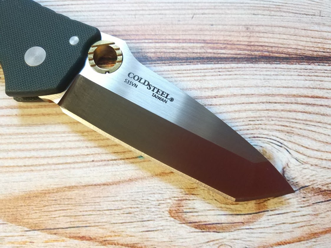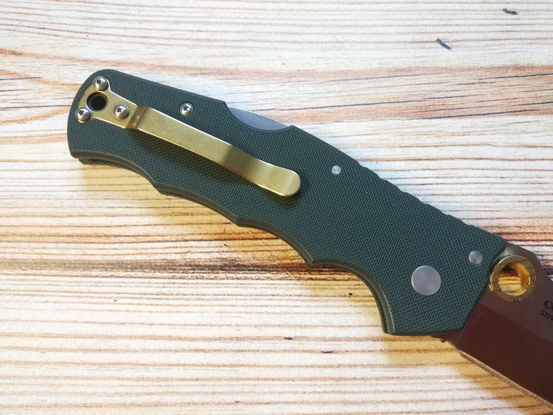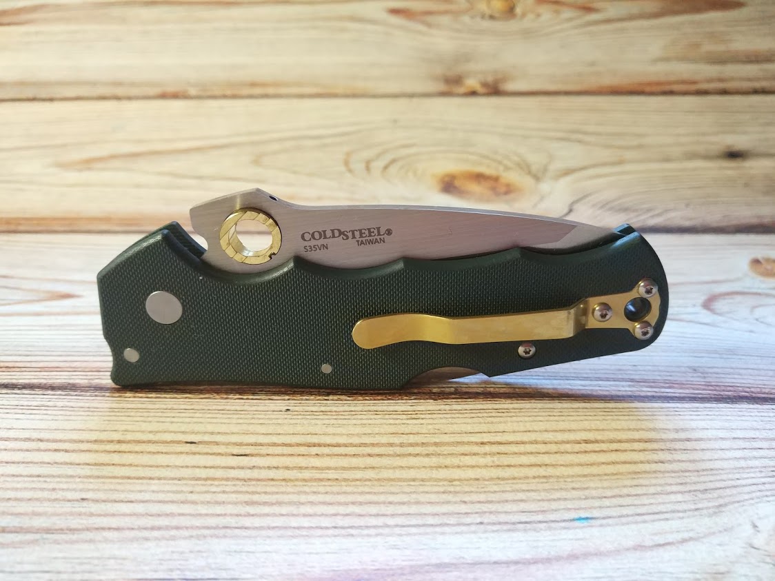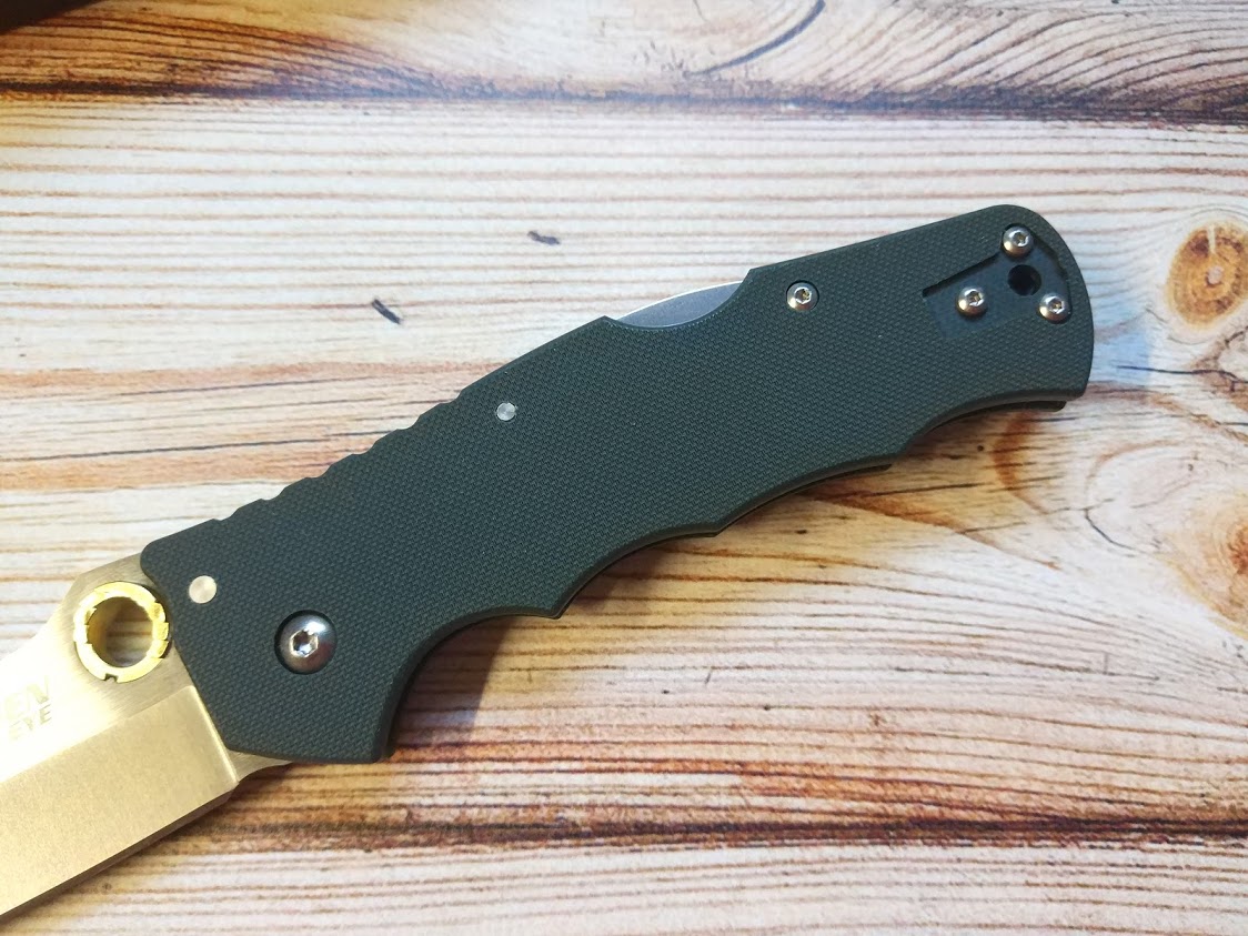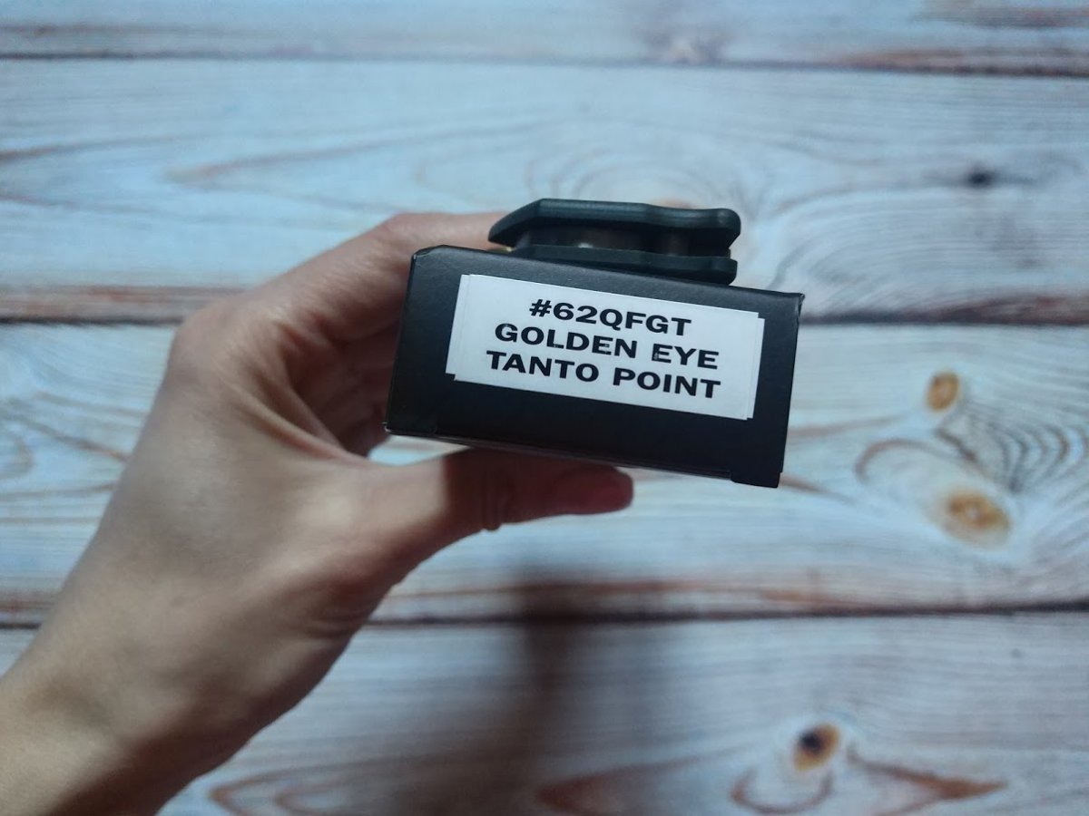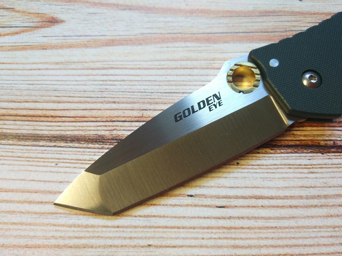 Предлагаю складной нож от компании Cold Steel (Колд Стил). Модель Golden Eye Tanto (62QFGT) CPM S35VN. Оригинал. Конкуренция в нише складных ножей среднего размера с ценником в средней (для США) и выше (для наших реалий) год от года становится всё более жесткой. Производители стараются реализовать новые идеи. Воплощением такой вот новой идеи и является нож Cold Steel Golden Eye Tanto Point. Немного непривычный для Cold Steel дизайн – дело вкуса, но то, что этот нож привлекает внимание - бесспорно. Главной особенностью, благодаря которой нож обрёл имя Golden Eye является втулка из жёлтого металла размещённая в подпальцевом отверстии клинка, такое решение оказалось удобным и оригинальным. Нож Golden Eye Tanto это городской EDC с премиальной сталью на клинке, привлекательной внешностью и приличным запасом прочности (на всякий случай). Нож оставляет впечатление законченного инструмента с удобной рукоятью и рабочим клинком готовым на многое. Порошковая коррозионностойкая сталь премиум класса CPM-S35VN использована как материал для клинка Cold Steel Golden Eye Spear Point. Сталь CPM-S35VN выпускается компанией Crucible Industries (USA), является улучшенным вариантом CPMS30V. Сталь CPM-S35VN стабильная и однородная, к её разработке приложил руку известный ножевой дизайнер Крис Рив. За счёт наличия карбидов ниобия S35VN имеет повышенные прочностные свойства, более устойчива к выкрашиванию режущей кромки и отлично держит заточку. Ещё одним несомненным плюсом стали CPM-S35VN является то, что клинок, выполненный из неё, относительно просто поддается правке и заточке. Танто-клинки от Cold Steel пробивные и зло-резучие – это ни для кого не секрет и нож Golden Eye Tanto не стал исключением. Прочнейшее острие способно выдержать серьёзные нагрузки, а вогнутые спуски от середины позволят резать различные материалы агрессивно и с удовольствием. Втулка из жёлтого металла интегрированная в отверстие клинка Cold Steel Golden Eye Tanto Point имеет специальные ступеньки для зацепа пальца при открытии клинка. И надо сказать зацеп за счёт такого исполнения получается отличный – раскрытие происходит контролируемо и чётко. Подъём обуха, перетекающий в подъём рукояти образует удобный упор для большого пальца. Финишная обработка клинка Cold Steel Golden Eye Tanto – приятный мелкий сатин. У Cold Steel получилось сделать относительно тонкую рукоять прямоугольного сечения невероятно удобной. Лучше всего нож Golden Eye будет себя чувствовать в крупной или средней руке. «Наждачная» мелкая фактура очень приятная на ощупь и намертво удерживает пальцы на своих местах. Золотой цвет довольно крупной клипсы приятно контрастирует и умело оттеняет насыщенный тёмно-зелёный цвет плашек из качественного G-10. Установить клипсу можно только в положении tip up на правой или левой стороне рукояти. Отверстие для темляка пронзает золотую клипсу и позволяет без усилий продеть в отверстие 5 мм паракорд. Традиционно для Cold Steel в конструкции ножа Golden Eye Spear Point применён их знаменитый замок Tri-Ad Lock. Думаю, каждый наслышан о его надёжности и несокрушимости – тот случай, когда это не просто слова. Ссылка модели на сайте производителя: https://www.coldsteel.com/golden-eye-tanto.html Видео от производителя: Ещё парочка для наглядности: Обзоров и видео по этой модели в сети уже довольно много, желающие могут дополнительно поискать-посмотреть. Характеристики, заявленные производителем: Длина клинка: 88,9 мм. Общая длина: 212,73 мм. Толщина клинка: 3,5 мм. М