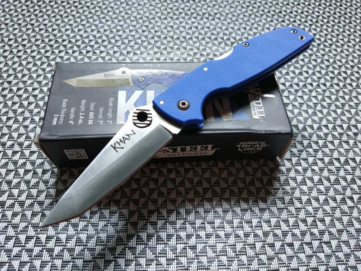 Клинок данного ножа изготавливается из коррозионностойкой стали AUS-8A производства японской компании Aichi Steel Works. Эту сталь любят за отличную износоустойчивость, невысокую цену, достаточную твёрдость при неплохой вязкости и хорошую коррозионную стойкость. Клинок Cold Steel Khan выполненный из этой марки стали имеет хорошие режущие свойства, долго сохраняет остроту и охотно поддаётся заточке.