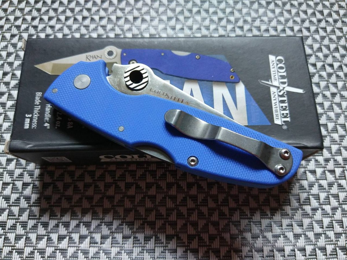 Лёгкий и прочный материал G-10 используется при изготовлении рукояти Cold Steel Khan. Стальные лайнеры в конструкции отсутствуют, поэтому нож имеет малый вес, комфортный для ежедневного ношения. Несколько не привычно для этого производителя, но на рукояти отсутствует какая-либо злая 3D фактура, поверхность плашек просто в меру шершавая. По удобству рукоять этого ножа может сравниться с рукоятью небольшого кухонника, влипающего в ладонь при работе, отличие только в том, что в сечении она прямоугольная и имеет небольшую толщину. На брюшке рукояти Khan ближе к клинку есть подпальцевая выемка и хороший упор, предотвращающий соскальзывание руки на лезвие. Простая, в меру жёсткая клипса может быть установлена на обе стороны в положении tip up, а вот темлячное отверстие не предусмотрено.