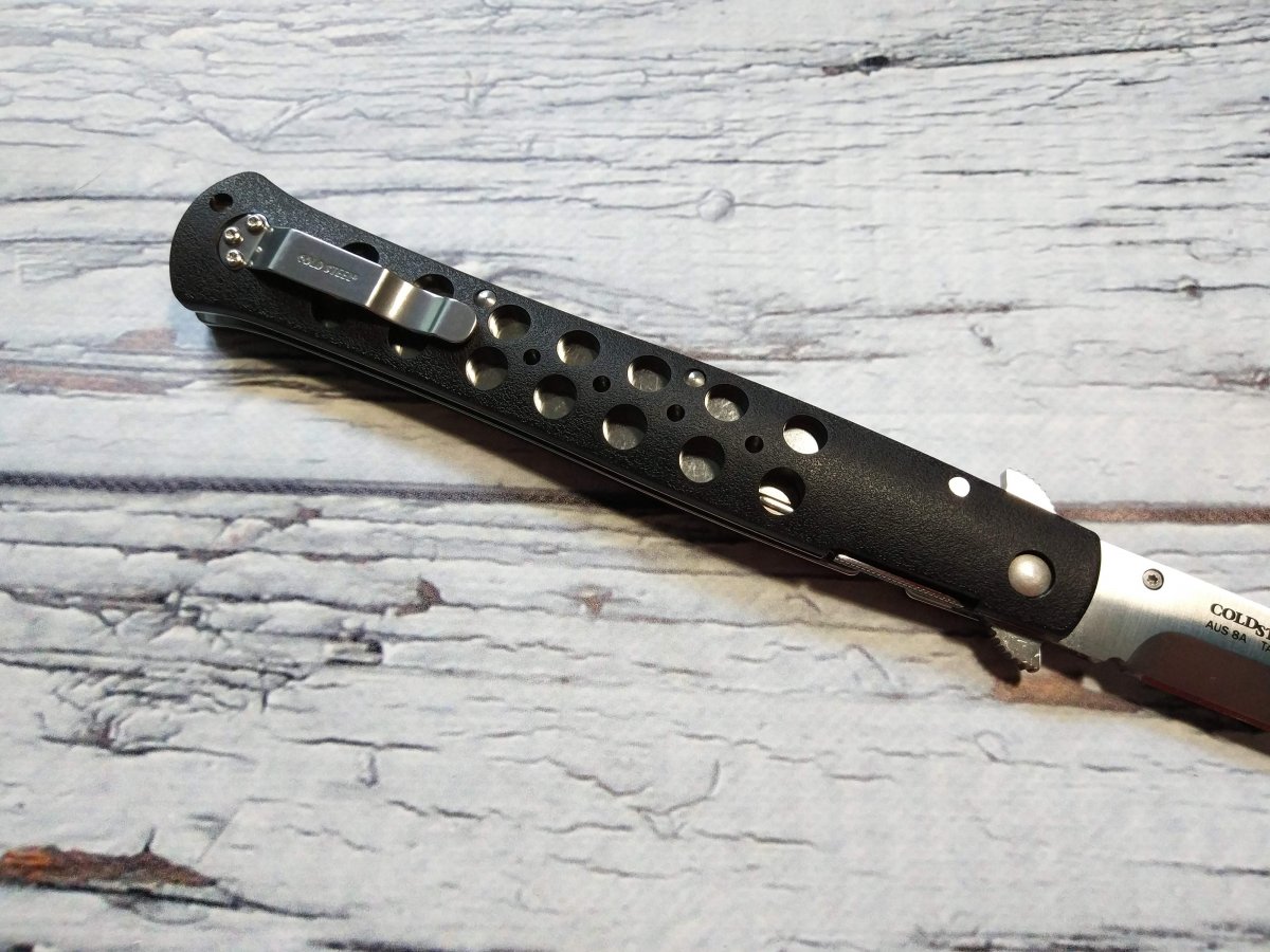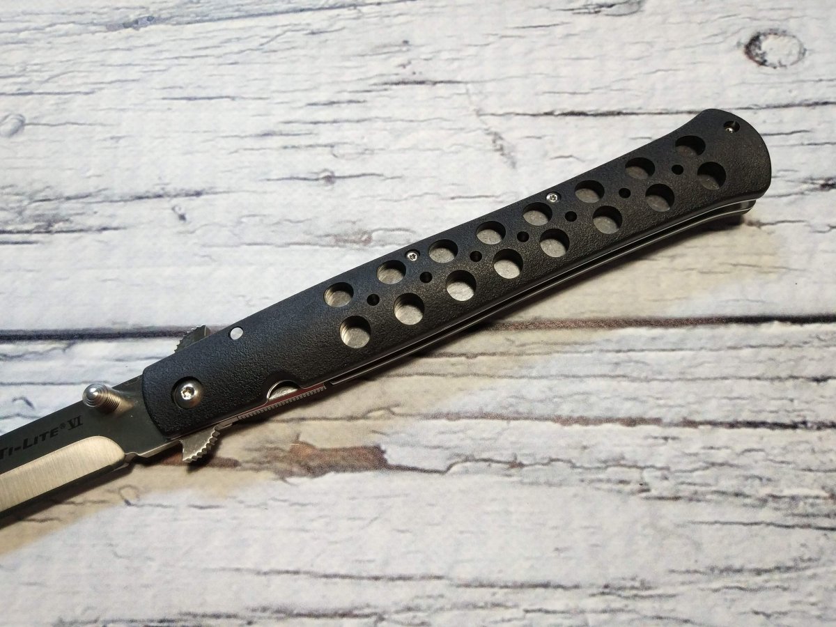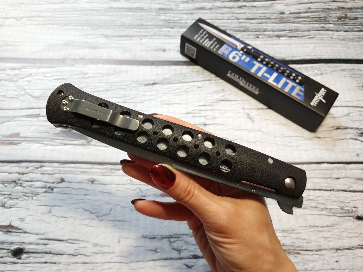 Шершавая пластиковая рукоять Cold Steel Ti Lite VI с двумя рядами отверстий часто подвергается кастомизации. Её исполняют из самых разных материалов, но (что важно) её форма, внешний абрис и полнота практически всегда близки к оригиналу. Это только подтверждает сбалансированность и удобство изначальных форм. Ti Lite VI больше подойдет правше - здесь использован модифицированный Liner-Lock (его удобнее складывать правой рукой) и не переставляемая клипса.