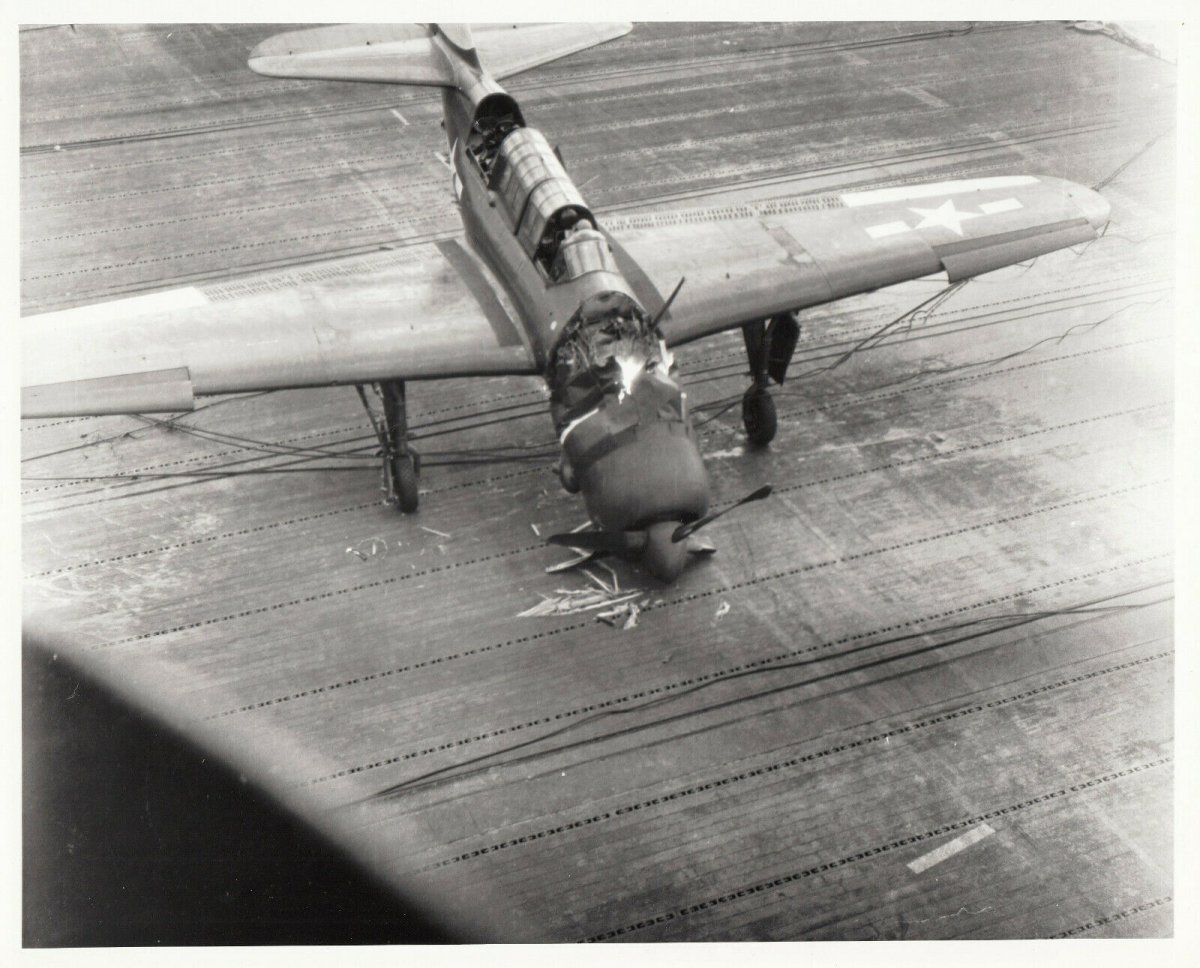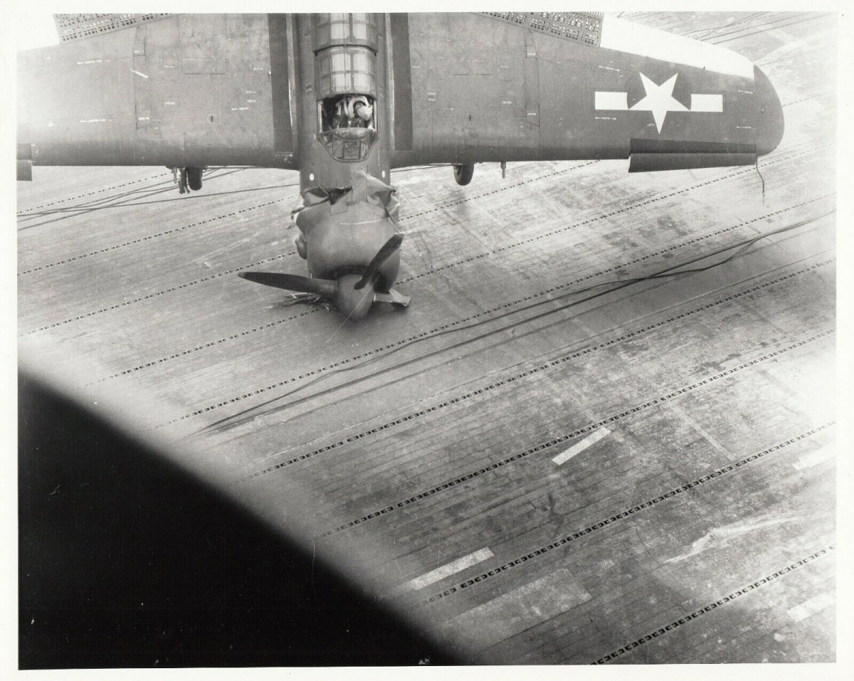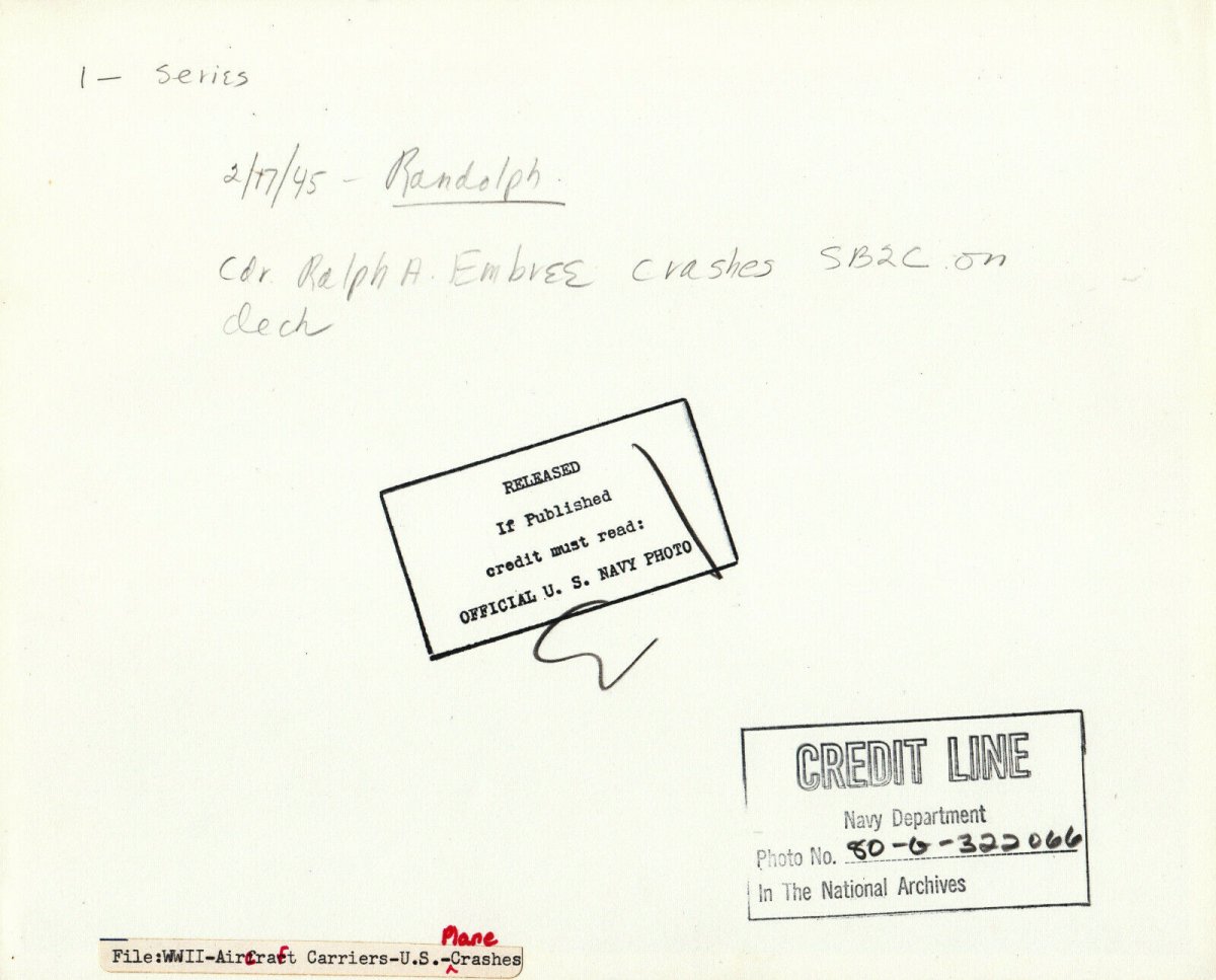 Curtiss SB2C Helldiver bomber crashing on the deck of USS Randolph aircraft carrier. Pencil caption on back reads, “2/17/45 Randolph - Cdr. Ralph Embree crashes SB2C on deck”. Cdr. Embree survived this crash but died three months later during raids in support of Okinawa Gunto operation, May 12, 1945. USS Randolph (CV/CVA/CVS-15) was one of 24 Essex-class aircraft carriers built during World War II for the United States Navy. Randolph was commissioned in October 1944, and served in several campaigns in the Pacific Theater of Operations, earning three battle stars.